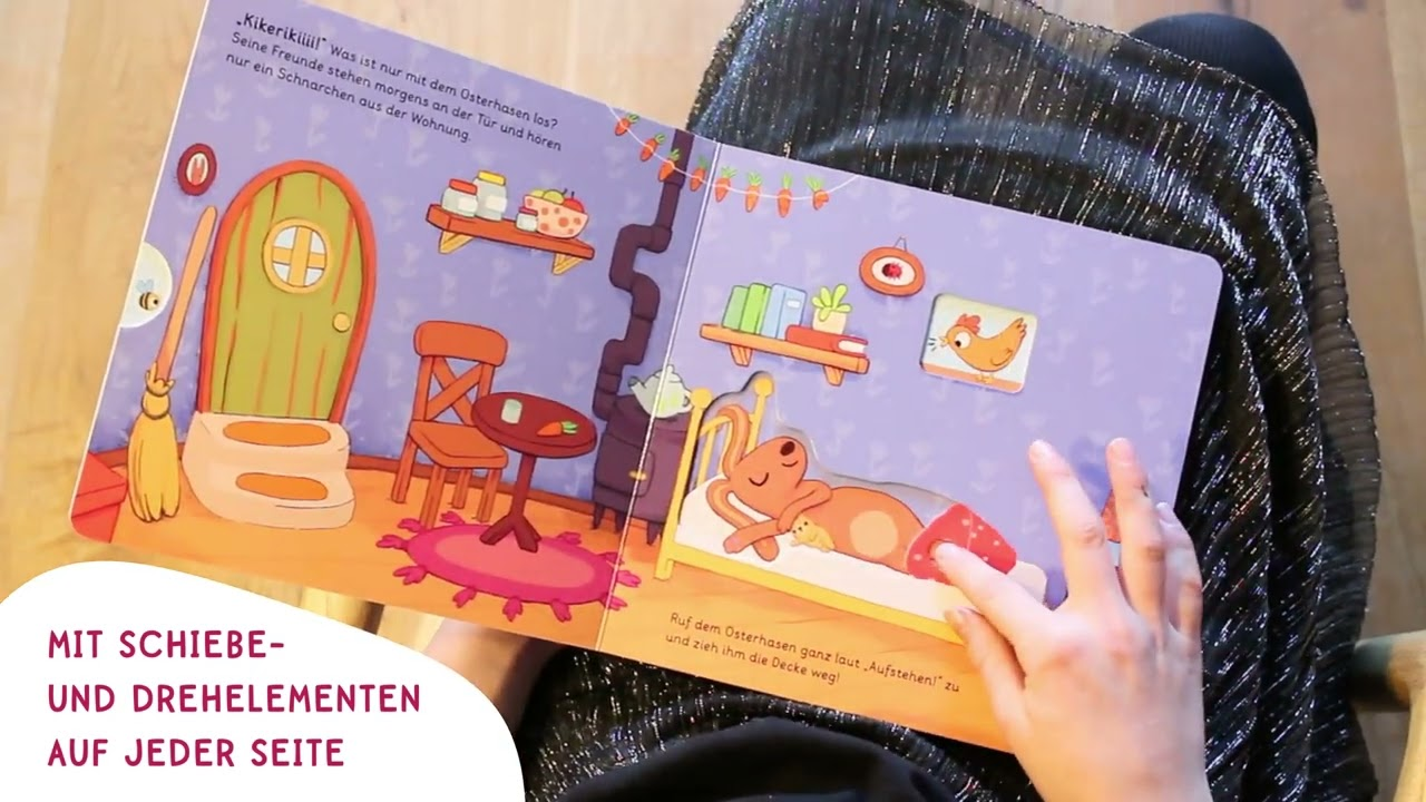 Ostern steht vor der Tür, doch der kleine Osterhase hat verschlafen! Jetzt heißt es: Aufwachen, Eier sammeln, bunt bemalen und schnell verstecken – und dabei braucht der Osterhase die Hilfe der Kinder. Mit lustigen Schiebe- und Dreheffekten können die Kleinen selbst aktiv werden. Jetzt kann der Osterhase seine morgendlichen Turnübungen machen, bei den Hühnern die Eier abholen, diese schön bemalen und mit seinen Freunden auf dem Motorrad davonbrausen. So wird die Geschichte lebendig und fördert ganz nebenbei die Feinmotorik.
