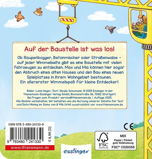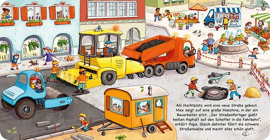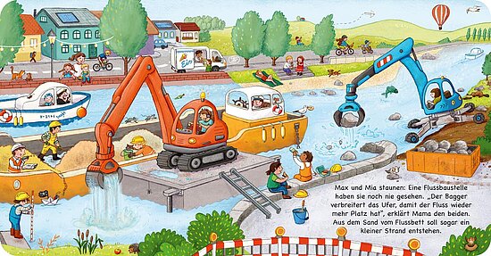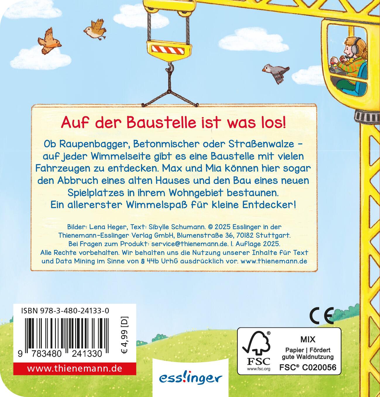 Mit den Geschwistern Max und Mia erleben kleine Baumeister:innen einen aufregenden Tag: Am Bahnhof, in der Stadt, auf der Baustelle am Fluss oder beim Bau eines neuen Spielplatzes – überall gibt es spannende Fahrzeuge, fleißige Bauarbeiter und viele Details zu entdecken. Die farbenfrohen Wimmelbilder werden von einfachen Suchaufgaben begleitet und machen das Mini-Wimmelbuch zum perfekten Begleiter für zu Hause oder unterwegs.