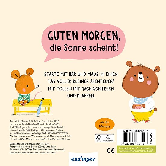 Die Sonne scheint zum Fenster herein und ein neuer Tag beginnt! Was steht heute alles an? Kinder ab 18 Monaten können Bär und Maus durch ihren Morgen helfen: Der Wasserhahn muss aufgedreht und der Toast muss aus dem Toaster geholt werden. Außerdem braucht Bär Hilfe beim Anziehen seiner Jacke. Mit den Schiebe-Elementen kein Problem! Im Nu können Bär und Maus ins Abenteuer starten: Auf geht’s zum Spielplatz!