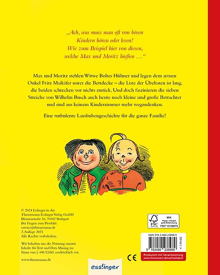 Wilhelm Busch (1832-1908) hat unseren Zitatenschatz bereichert wie kaum ein anderer: "Dieses war der erste Streich, doch der zweite folgt sogleich ..." So wird die Lausbubengeschichte für kleine und auch große Max- und Moritz-Fans immer wieder aufs Neue zu einem echten Vorlesevergnügen!