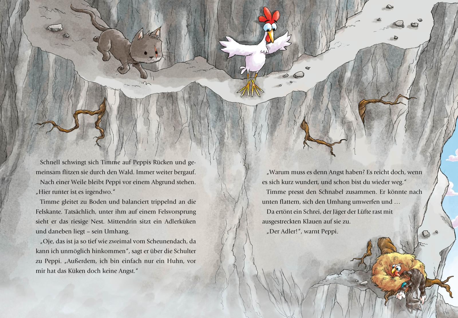 Ein Picknick mit Hindernissen, eine unterirdische Suche, besondere Übungen gegen Angst, ein Zaun mit Überraschungs-Brizz, zu viele Übernachtungsgäste auf einmal, ein verschwundener Bach, ein ganz schön frecher Waschbär und ein verloren geglauber Katzenumhang – Huhn Timme hat als Katzenhuhn wieder jede Menge spannende und witzige Abenteuer um die Ohren.