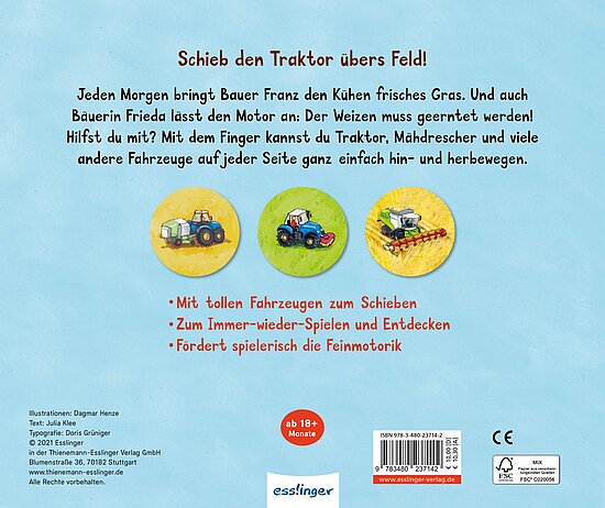 Fahr mit! Hier können schon die Kleinen spielerisch auf dem Bauernhof mithelfen! Große Schiebe-Elemente auf jeder Seite machen dieses Mitmach-Buch zum idealen Geschenk für Kinder ab 18 Monaten zum Immer-wieder-Spielen. Auf jeder Doppelseite lassen sich Traktor, Mähdrescher und Co. mit dem Finger ganz einfach hin- und herbewegen. Ganz nebenbei wird dabei die Feinmotorik gefördert.