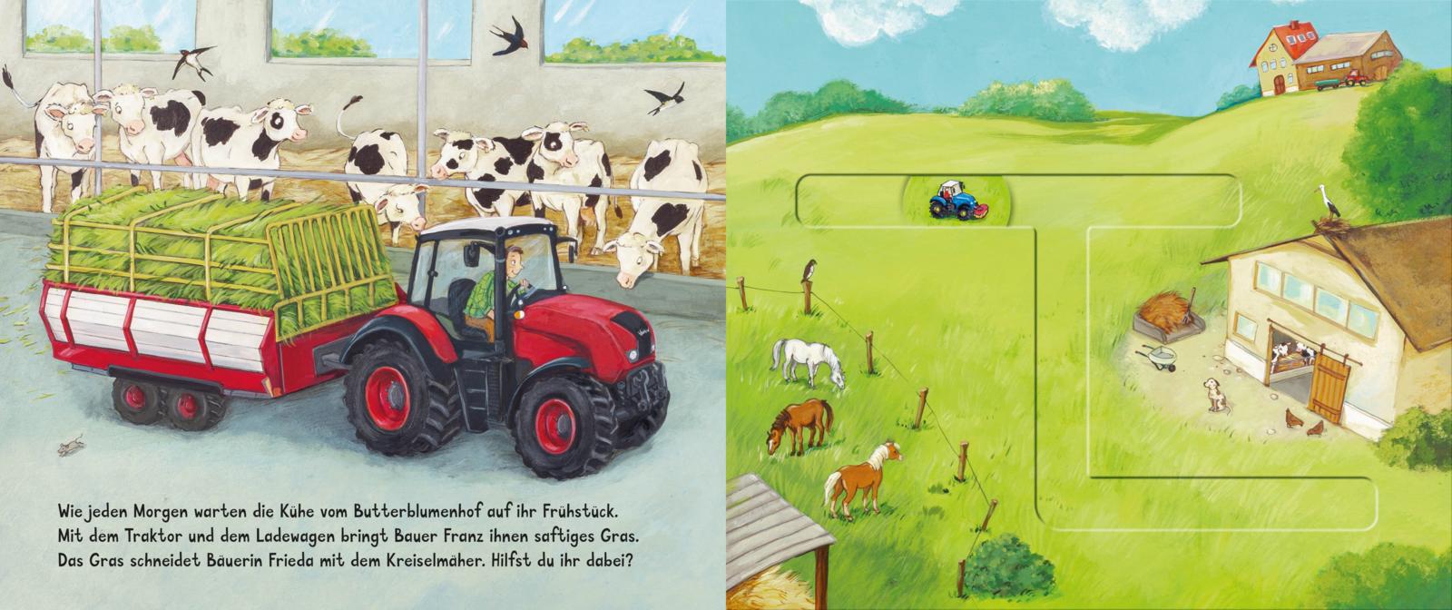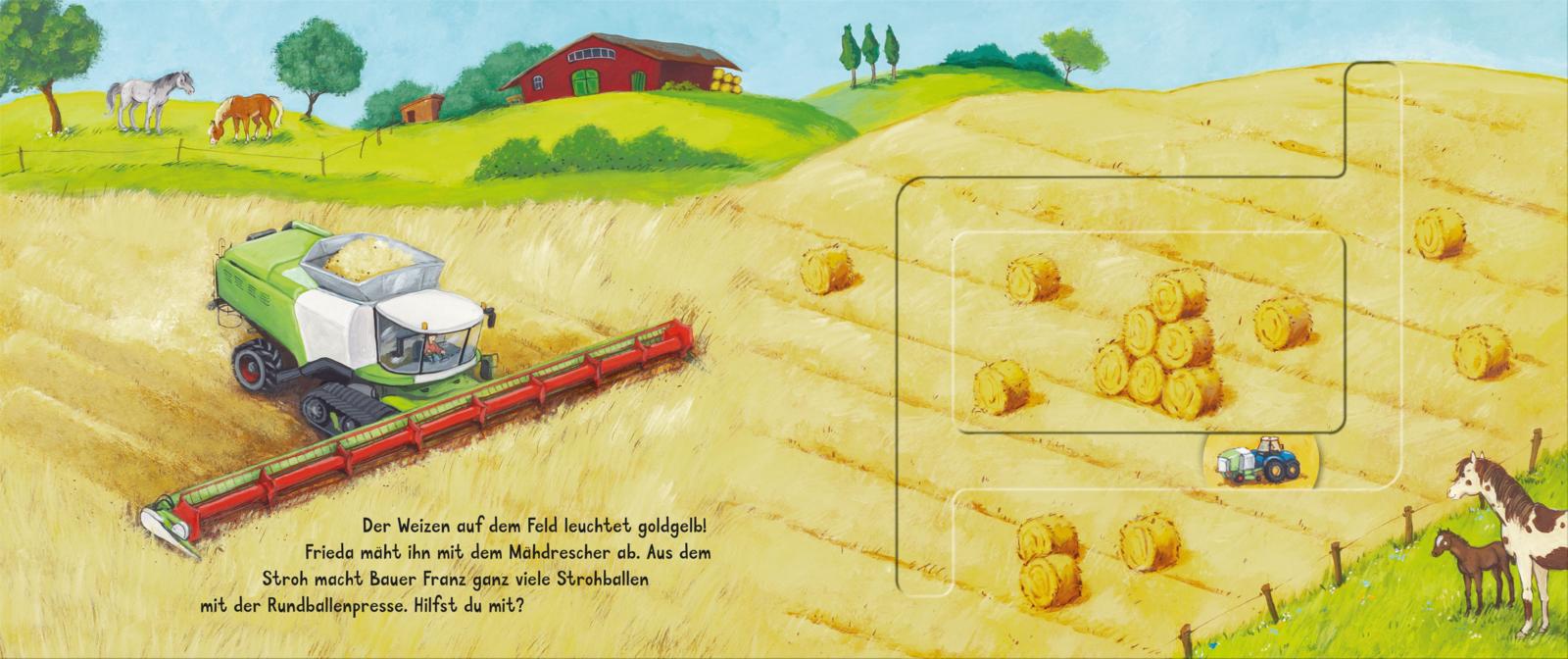 Frisches Gras für die Kühe wird mit dem Traktor gebracht. Der Mähdrescher mäht das goldene Weizenfeld. Der Milchsammelwagen bringt die Milch zur Molkerei. Und für den großen Markttag in der Stadt packen Bauer Franz und Bäuerin Frieda ihren Transporter mit dem besten Obst und Gemüse von ihrem Hof. Los geht es! Mitfahren ist ganz einfach.