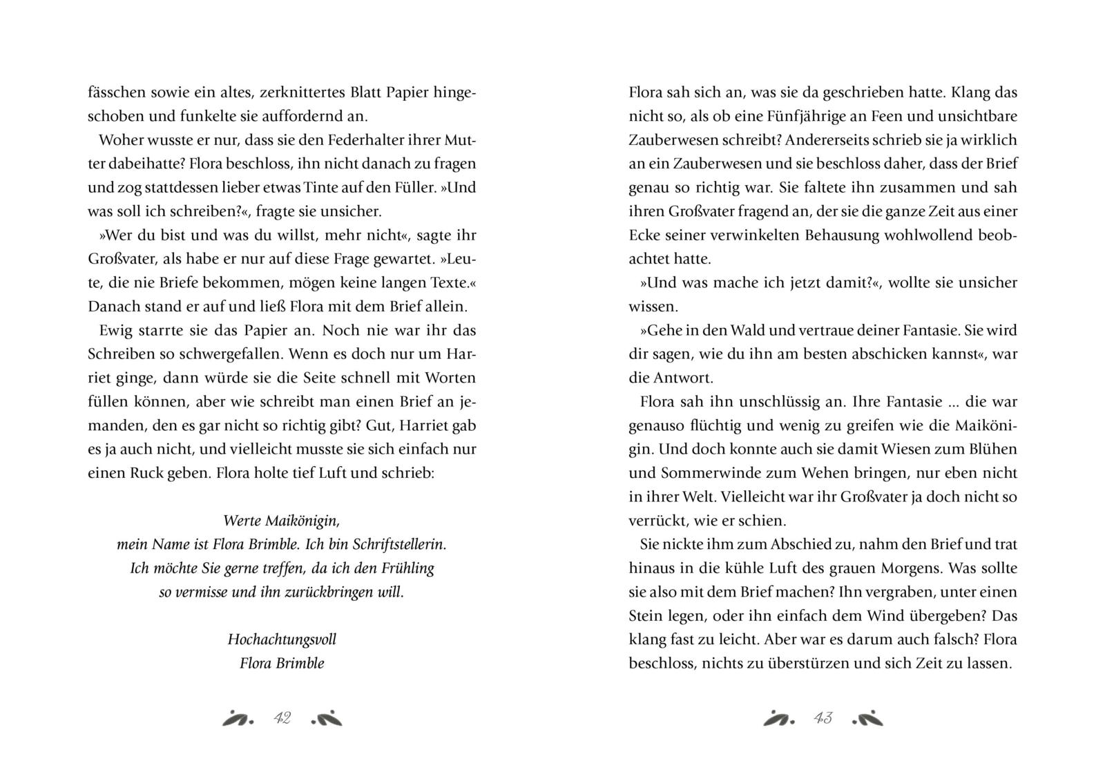In Rye, einem kleinen englischen Dorf, will der Winter einfach nicht weichen – und Flora Brimble fühlt sich genauso grau wie die Welt um sie herum. Doch als sie an ihrem Geburtstag eine besondere Tinte kauft, beginnt für sie das größte Abenteuer ihres Lebens. Flora will den Frühling zurückholen und macht sich auf die Suche nach der Maikönigin, die mit ihren Zauberkräften Sonne und Blumen zurückbringen kann. Auf ihrem Weg begegnet sie einem klugen Kobold, einem sprechenden Eichhörnchen und einer bösen Hexe, die alles daran setzt, Floras Mut zu brechen. Doch mit Fantasie, Freundschaft und einer Prise Magie wächst Flora über sich hinaus – und entdeckt, wie viel Hoffnung in einer Geschichte stecken kann.