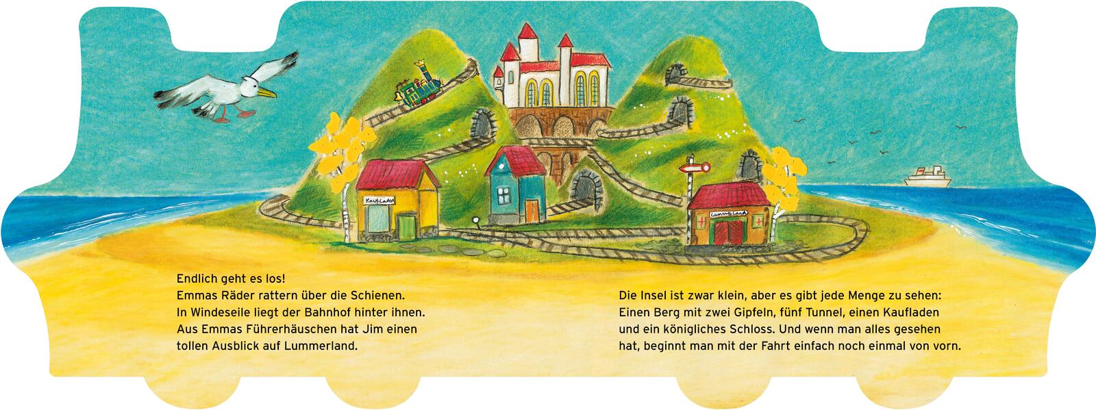 Dieses fantasievolle Pappbuch lädt Kinder ab 2 Jahren zu einer fröhlichen Zugfahrt nach Lummerland ein. Gemeinsam mit Jim Knopf, Lukas dem Lokomotivführer und der Lokomotive Emma entdecken die kleinen Leser:innen die berühmte Insel mit den zwei Bergen und lernen ihre freundlichen Bewohner:innen kennen. Die stabile Ausstattung und die besondere Form machen das Buch zu einem echten Hingucker im Kinderzimmer und zu einem wunderbaren Geschenk.