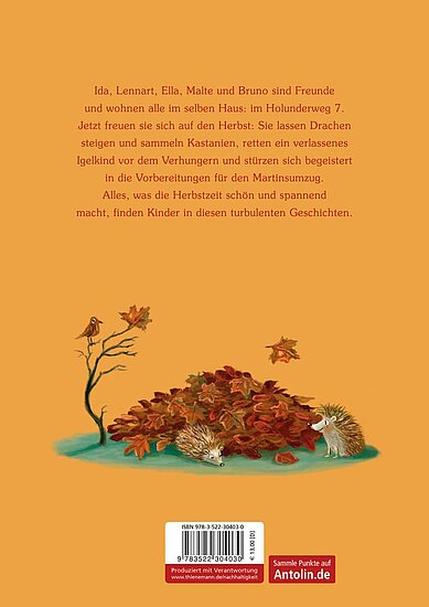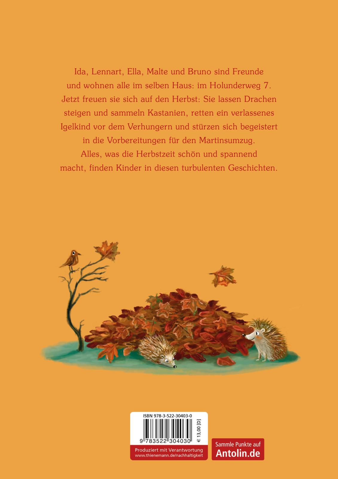 Ida, Lennart, Ella, Malte und Bruno sind Freunde und wohnen alle im selben Haus: im Holunderweg 7. Jetzt freuen sie sich auf den Herbst: Sie lassen Drachen steigen und sammeln Kastanien, retten ein verlassenes Igelkind vor dem Verhungern und stürzen sich begeistert in die Vorbereitungen für den Martinsumzug. Alles, was die Herbstzeit schön und spannend macht, finden Kinder in diesen turbulenten Geschichten. Der Nachfolger des Erfolgstitels "Weihnachten im Holunderweg" (ISBN 978-3-522-30369-9).