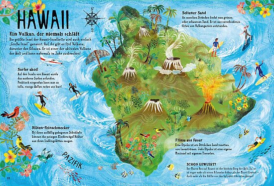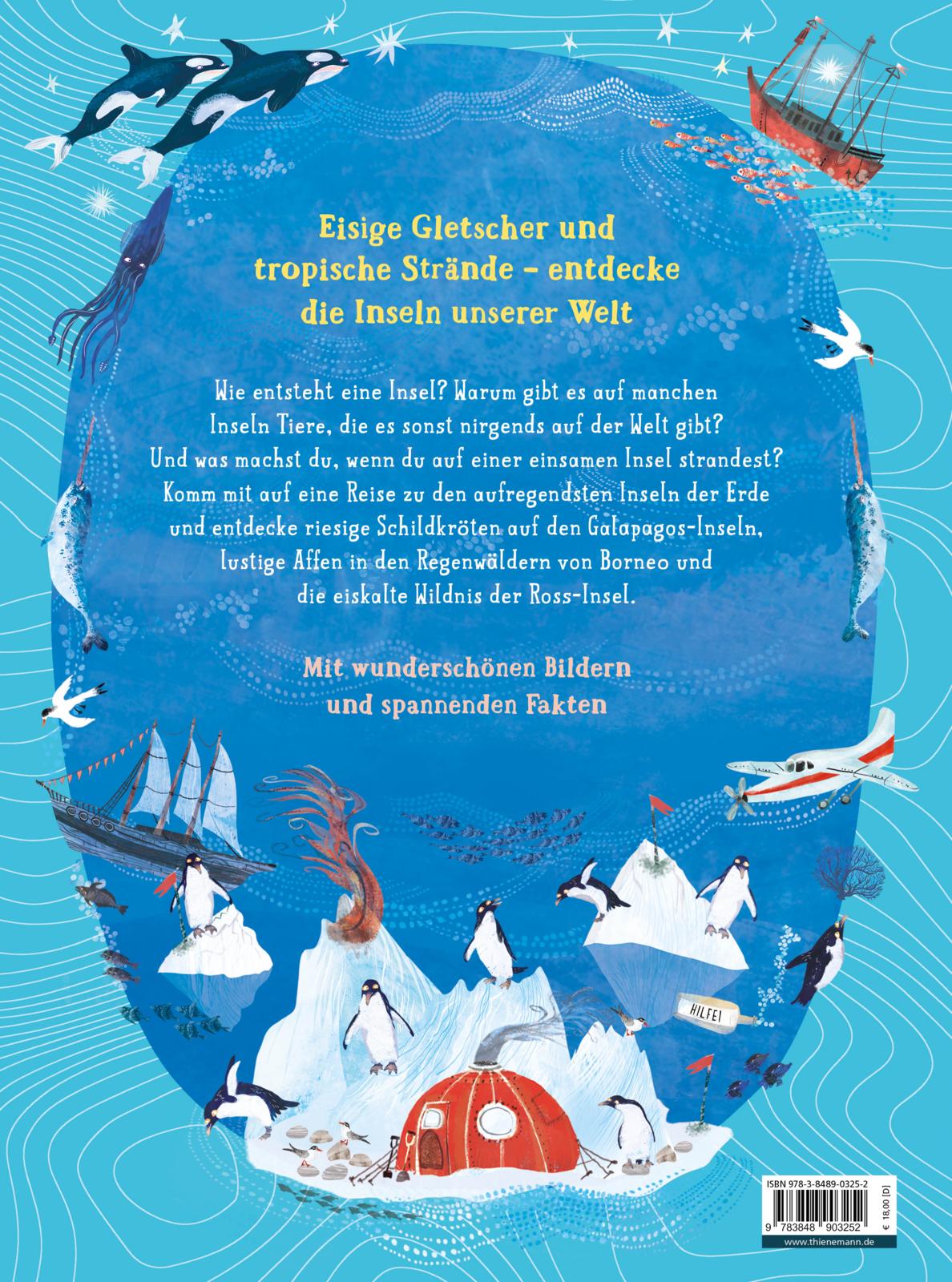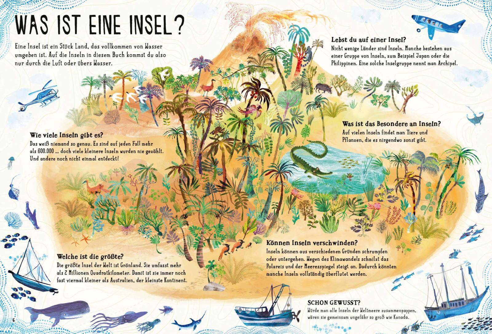 Was ist eigentlich eine Insel? Warum gibt es auf manchen Inseln Tiere, die sonst nirgends leben? Und wie fühlt es sich an, auf einer einsamen Insel zu stranden? Dieses außergewöhnliche Bilderbuch nimmt Kinder ab 4 Jahren mit auf eine abenteuerliche Reise rund um den Globus – von Hawaii über Sansibar bis zu den eisigen Weiten von Spitzbergen. Jede Seite steckt voller überraschender Fakten, spannender Geschichten und atemberaubender Naturwunder: Fliegende Fische, feuerspeiende Vulkane, geheimnisvolle Lemuren und flüsternde Bäume warten darauf, entdeckt zu werden.