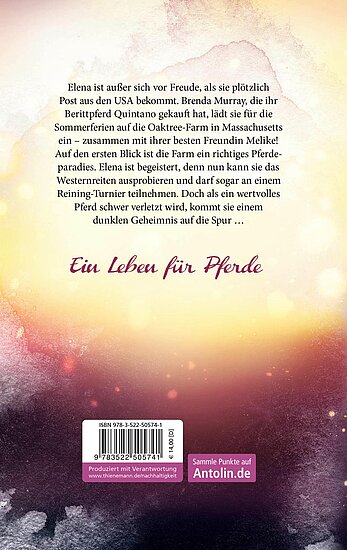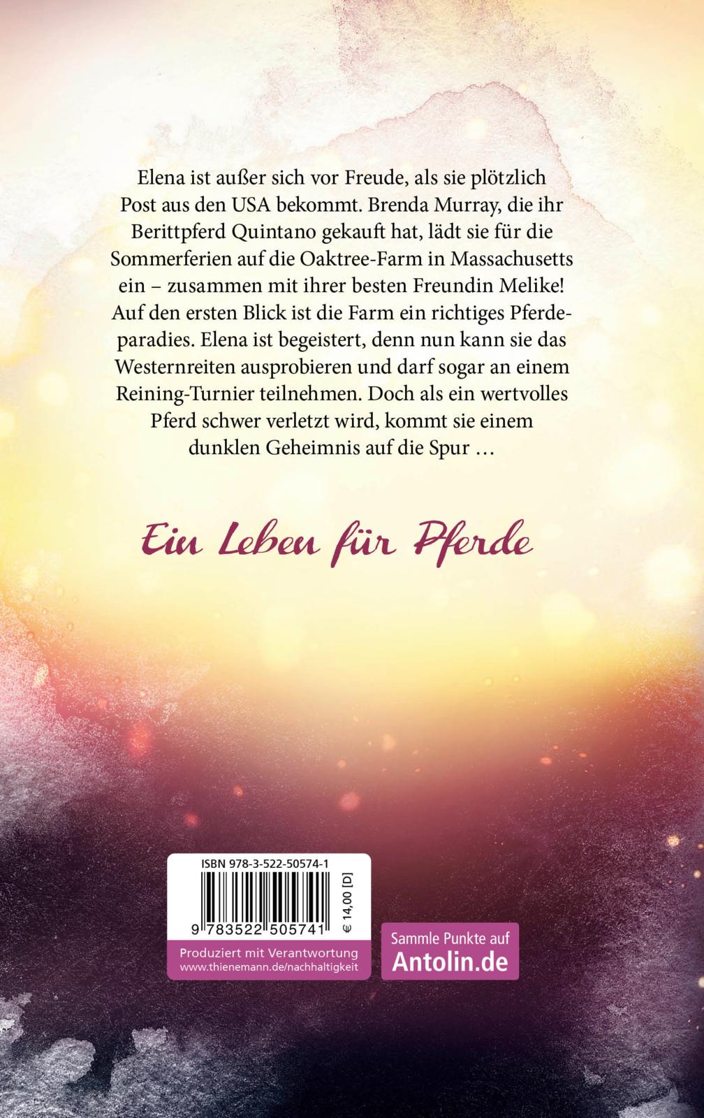 Elena ist außer sich vor Freude, als sie plötzlich Post aus den USA bekommt. Brenda Murray, die ihr Berittpferd Quintano gekauft hat, lädt sie für die Sommerferien auf die Oaktree-Farm in Massachusetts ein – zusammen mit ihrer besten Freundin Melike! Auf den ersten Blick ist die Farm ein richtiges Pferdeparadies. Doch als ein wertvolles Pferd schwer verletzt wird und die Tochter der Besitzerin verschwindet, kommt Elena einem dunklen Geheimnis auf die Spur …