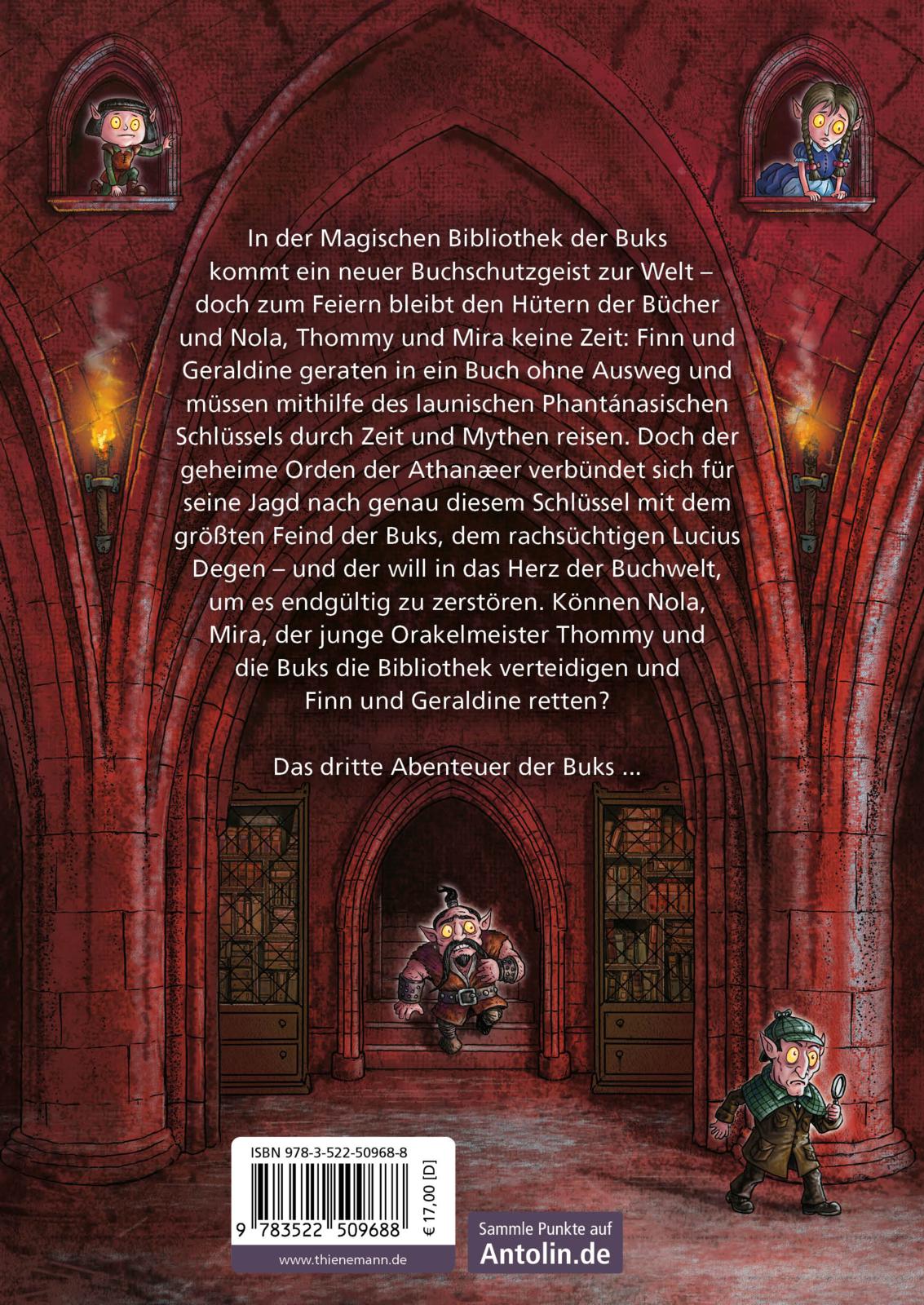 In der Magischen Bibliothek der Bukskommt ein neuer Buchschutzgeist zur Welt – doch zum Feiern bleibt den Hütern der Bücher und Nola, Thommy und Mira keine Zeit: Finn und Geraldine geraten in ein Buch ohne Auswegund müssen mithilfe des launischen Phantánasischen Schlüssels durch Zeit und Mythen reisen. Doch der geheime Orden der Athanæer verbündet sich für seine Jagd nach genau diesem Schlüssel mit dem größten Feind der Buks, dem rachsüchtigen Lucius Degen – und der will in das Herz der Buchwelt, um es endgültig zu zerstören. Können Nola, Mira, der junge Orakelmeister Thommy und dieBuksdie Bibliothek verteidigen und Finn und Geraldine retten?