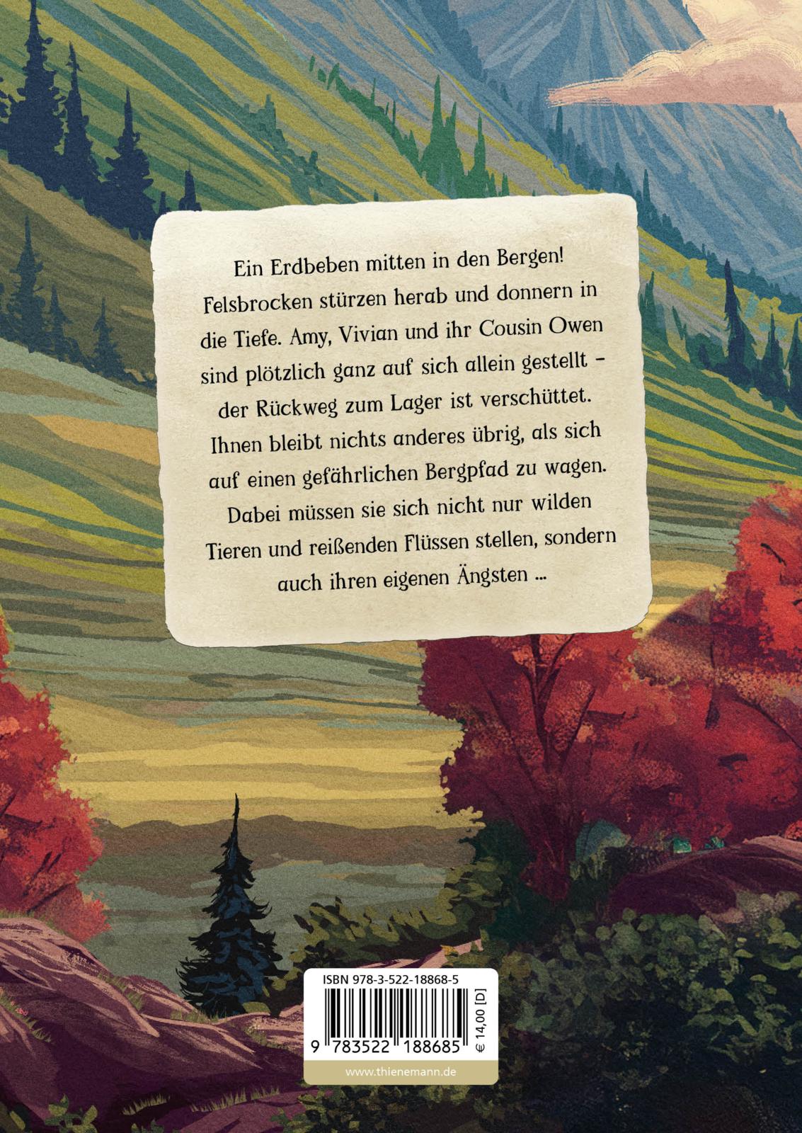 Ein Erdbeben mitten in den Bergen! Felsbrocken stürzen herab und donnern in die Tiefe. Amy, Vivian und ihr Cousin Owen sind plötzlich ganz auf sich allein gestellt – der Rückweg zum Lager ist verschüttet. Ihnen bleibt nichts anderes übrig, als sich auf einen gefährlichen Bergpfad zu wagen. Dabei müssen sie sich nicht nur wilden Tieren und reißenden Flüssen stellen, sondern auch ihren eigenen Ängsten ...