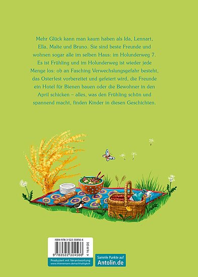 Mehr Glück kann man kaum haben als Ida, Lennart, Ella, Malte und Bruno. Sie sind beste Freunde und wohnen sogar alle im selben Haus: im Holunderweg 7. Es ist Frühling und im Holunderweg ist wieder jede Menge los: ob an Fasching Verwechslungsgefahr besteht, das Osterfest vorbereitet und gefeiert wird, die Freunde ein Hotel für Bienen bauen oder die Bewohner in den April schicken – alles, was den Frühling schön und spannend macht, finden Kinder in diesen Geschichten.