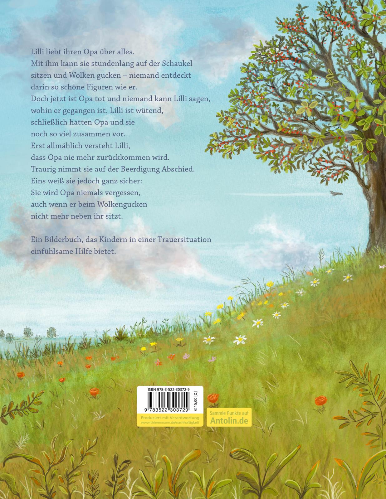 Lilli liebt ihren Opa über alles. Mit ihm kann sie stundenlang auf der Schaukel sitzen und Wolken gucken – niemand entdeckt darin so schöne Figuren wie er. Doch jetzt ist Opa tot und niemand kann Lilli sagen, wohin er gegangen ist. Lilli ist wütend, schließlich hatten Opa und sie noch so viel zusammen vor. Erst allmählich versteht Lilli, dass Opa nie mehr zurückkommen wird. Traurig nimmt sie auf der Beerdigung Abschied. Eins weiß sie jedoch ganz sicher: Sie wird Opa niemals vergessen, auch wenn er beim Wolkengucken nicht mehr neben ihr sitzt. Ein tröstliches Bilderbuch über den Verlust des Opas.