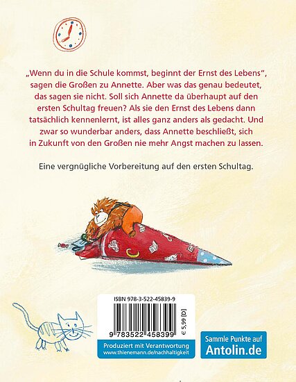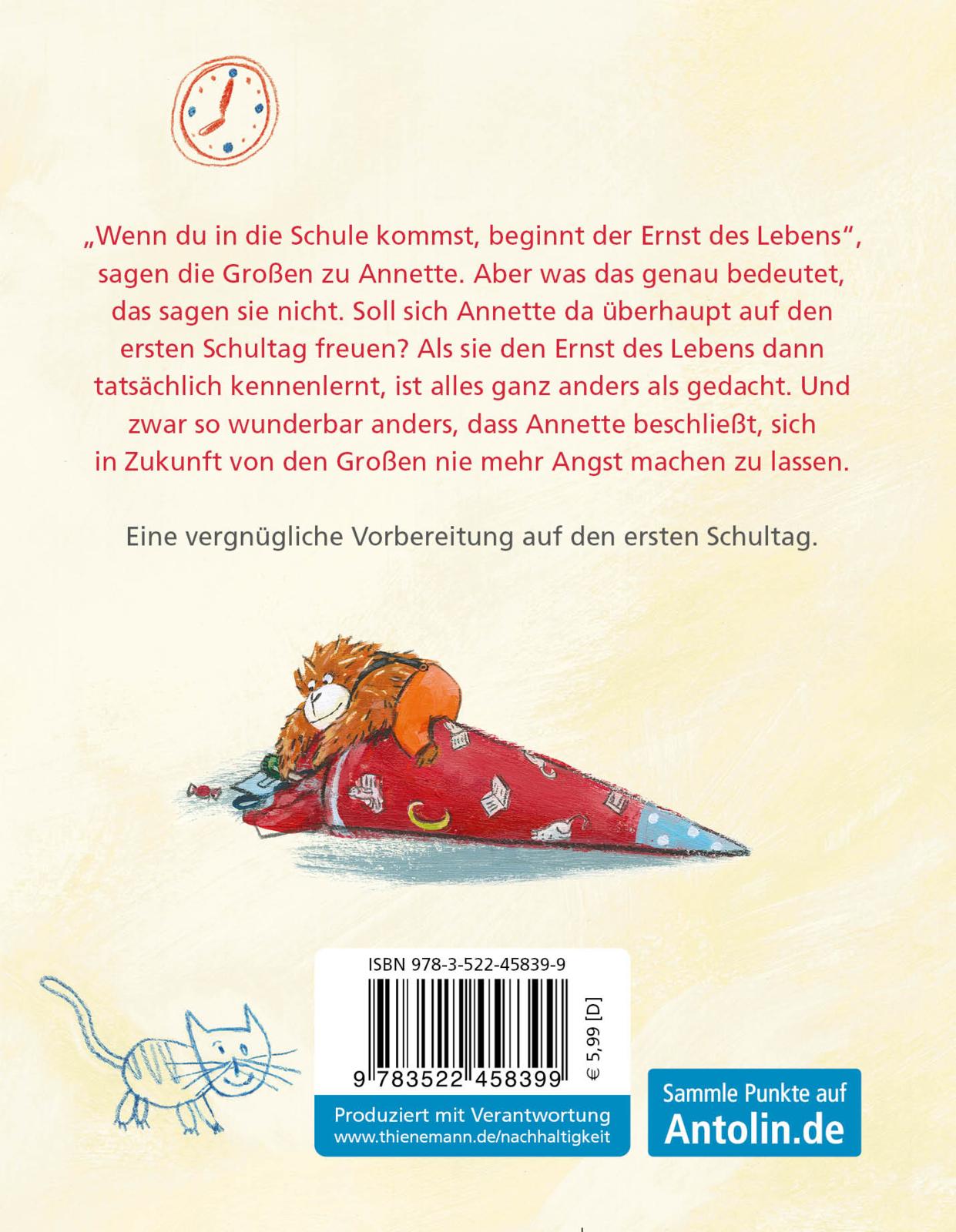"Wenn du in die Schule kommst, beginnt der Ernst des Lebens", sagen alle zu Annette. Wie der wohl aussieht? Und wie soll sie sich da noch auf ihren ersten Schultag freuen? Doch dann kommt alles ganz anders und Annette beschließt, sich in Zukunft keine Angst mehr von den Großen machen zu lassen. Eine vergnügliche Vorbereitung auf den ersten Schultag.