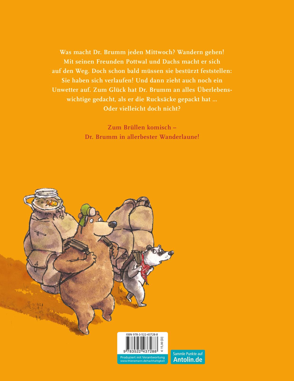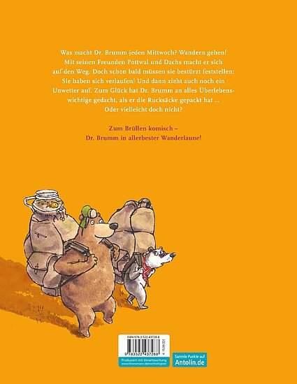 Dr. Brumm macht das, was er jeden Mittwoch macht – wandern gehen! Mit seinen Freunden Pottwal und Dachs marschiert er los. „Die Rucksäcke wiegen so viel, als hättest du Steine eingepackt“, jammert Dachs. „Eine vernünftige Ausrüstung ist das A und Oho“, sagt Dr. Brumm. Als erfahrener Wanderführer hat er nämlich an alles gedacht. Oder etwa nicht?