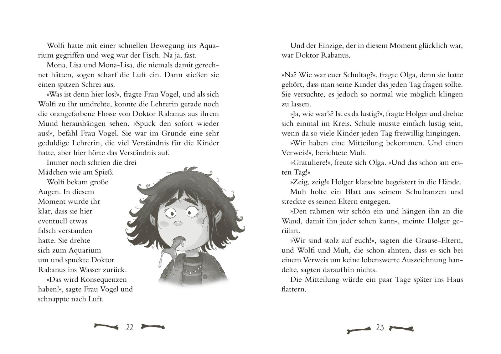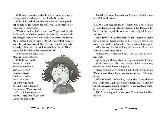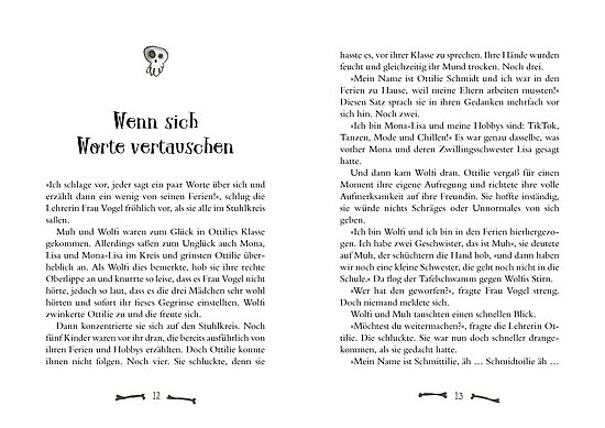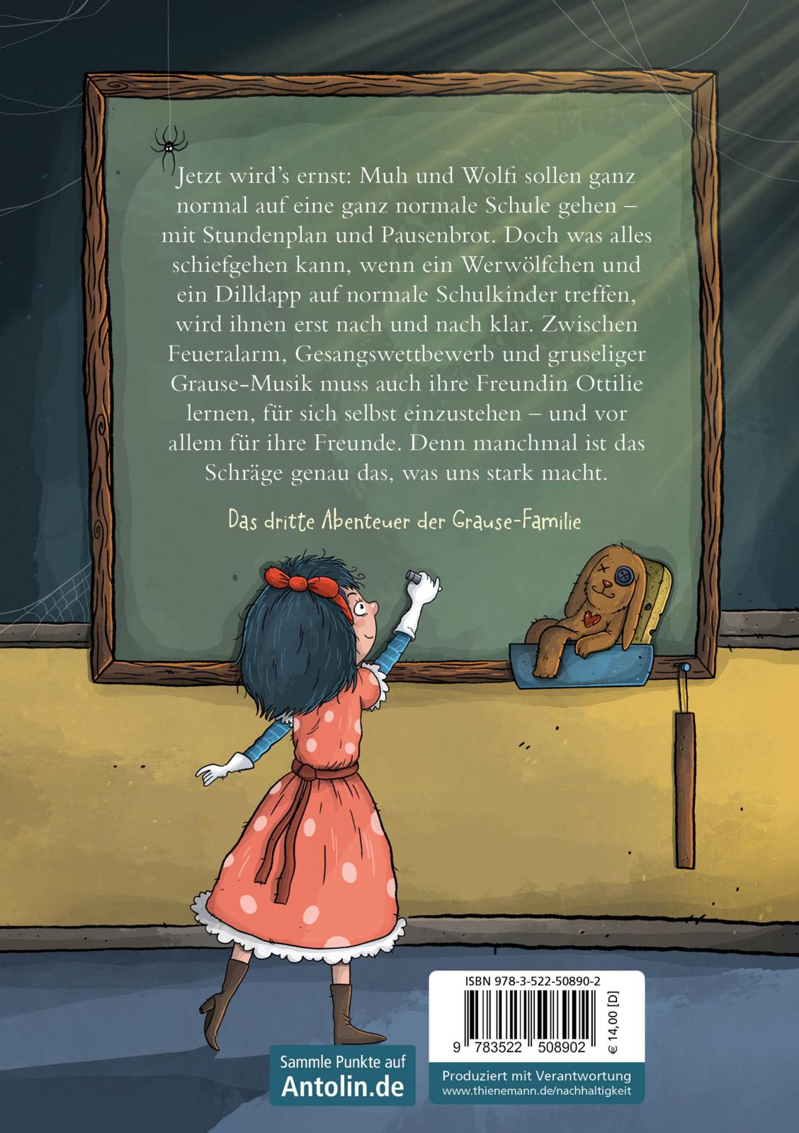 Jetzt wird’s ernst: Muh und Wolfi sollen ganz normal auf eine ganz normale Schule gehen – mit Stundenplan und Pausenbrot. Doch was alles schiefgehen kann, wenn ein Werwölfchen und ein Dilldapp auf normale Schulkinder treffen, wird ihnen erst nach und nach klar. Zwischen Feueralarm, Gesangswettbewerb und gruseliger Grause-Musik muss auch ihre Freundin Ottilie lernen, für sich selbst einzustehen – und vor allem für ihre Freunde. Denn manchmal ist das Schräge genau das, was uns stark macht.