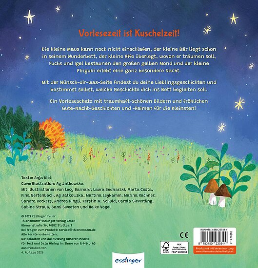 Mit der Wünsch-dir-was-Seite bestimmen die Kleinen selbst, welche Gute-Nacht-Geschichte sie ins Bett begleiten soll und ihnen schöne Träume bringen wird. Jede dieser 14 Drei-Minuten-Geschichten ist ein wunderbarer Einschlaf-Helfer!