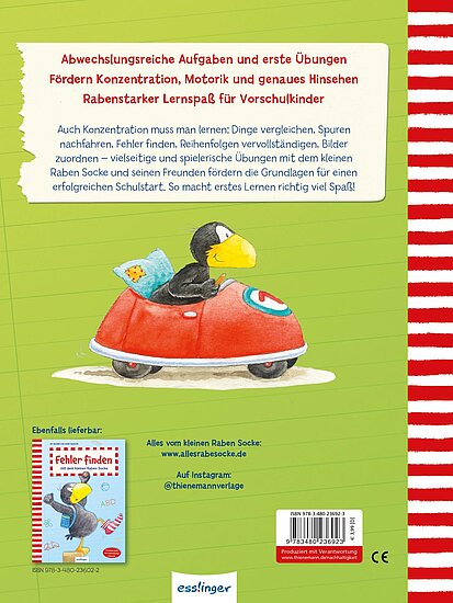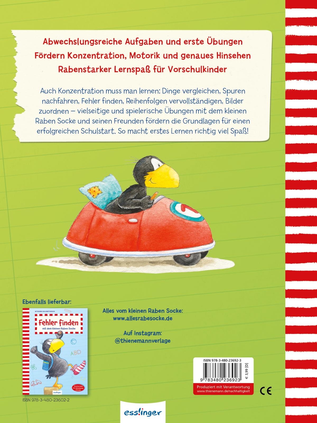 Sich richtig zu konzentrieren lässt sich schon früh trainieren! Dinge vergleichen, Spuren nachfahren, Fehler finden, Reihenfolgen vervollständigen, Bilder ordnen oder zuordnen ... vielseitige Aufgaben und Übungen fördern die Konzentrationsfähigkeit, das genaue Hinsehen, das logische Denken und die Feinmotorik. Spielerisch wird dabei die Schreibhand geschult und Farben, Formen, erste Buchstaben und Zahlen erlernt – das ist beste Vorbereitung für den erfolgreichen Schulstart. Und mit dem kleinen Raben Socke und seinen Freunden macht erstes Lernen richtig viel Spaß!
