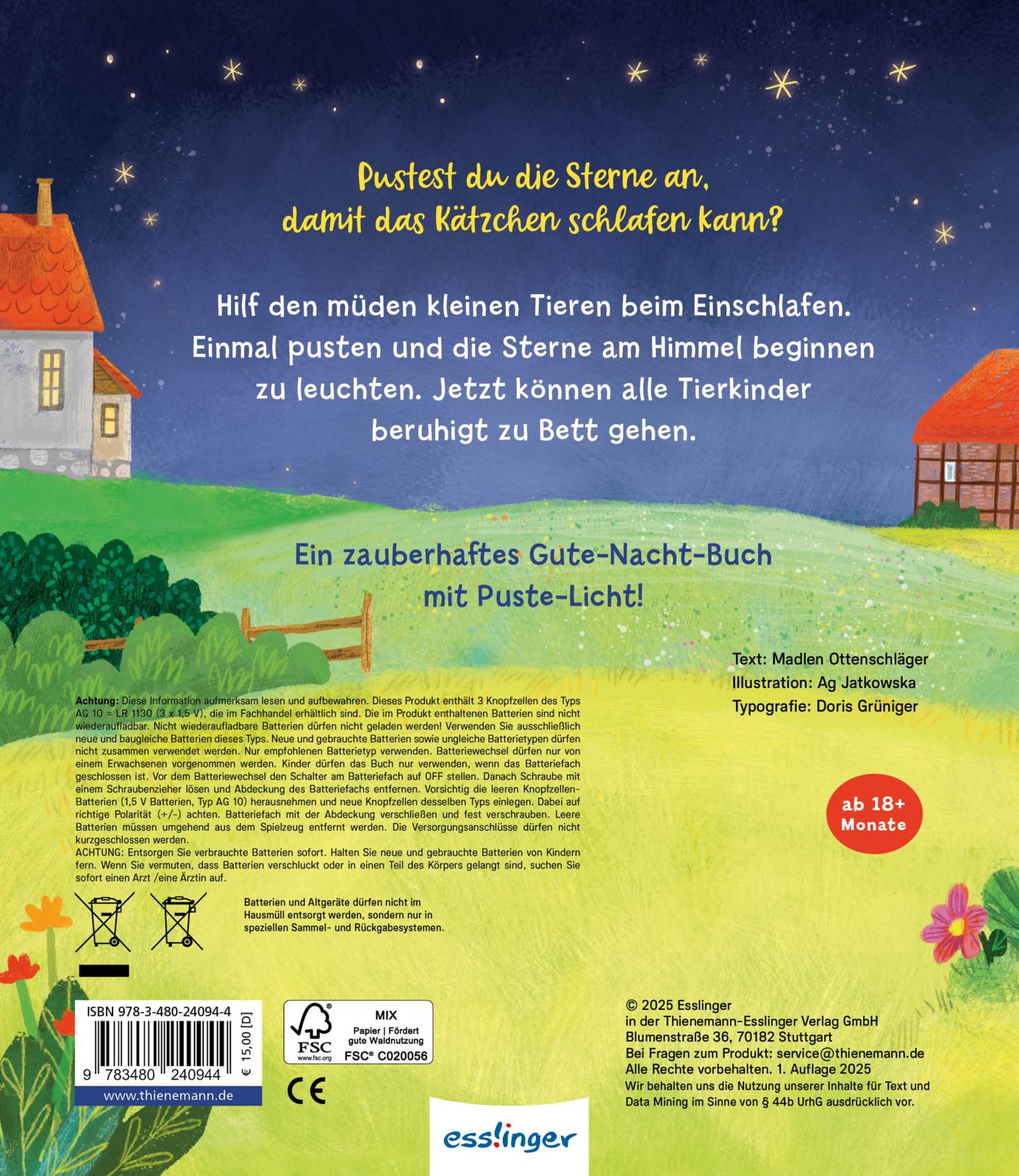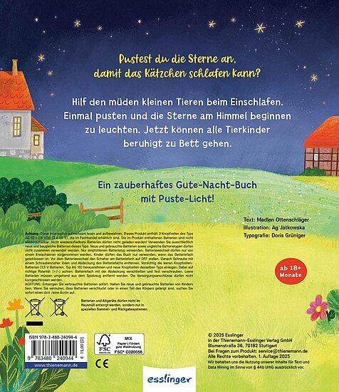 Die im Buch integrierten LED-Lämpchen werden durch den Luftstrom beim Pusten aktiviert und beginnen wie durch Zauberhand zu leuchten! Um die Batterie zu schonen, wird nach 2 Minuten Inaktivität automatisch ein Sleep-Modus aktiviert. Durch erneutes Einschalten ist das Buch für eine neue Puste-Runde einsatzbereit! So können schon die Allerkleinsten den müden Tierkindern beim Einschlafen helfen.