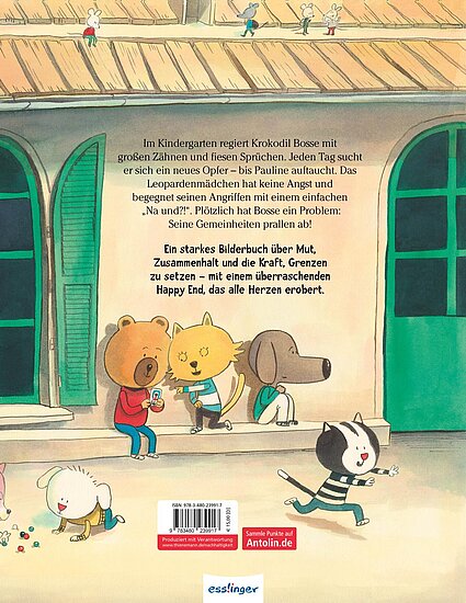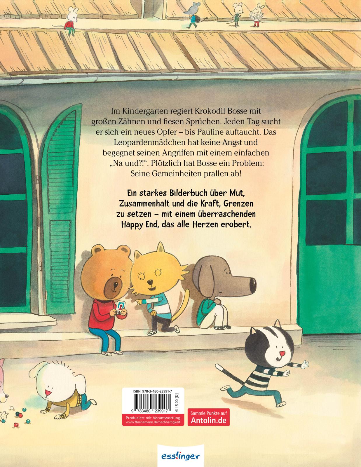 Im Kindergarten hat Krokodil Bosse das Sagen. Im Piesacken ist er der Größte. Jeden Morgen knöpft er sich ein anderes Kind vor. Und niemand wagt es, sich dagegen zu wehren ... bis das LeopardenmädchenPauline neu an den Kindergarten kommt. Wann immer Bosse sich von nun an über andere lustig macht, hat sie nur eine Antwort parat: Na und?! Da verschlägt es Bosse glatt die Sprache, denn seine Worte haben keine Macht mehr über die anderen. Und Bosse? Schafft es endlich, zu Hause seinem fiesen großen Bruder Paroli zu bieten. Und sich bei den anderen zu entschuldigen!