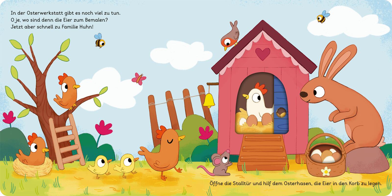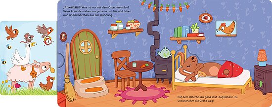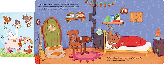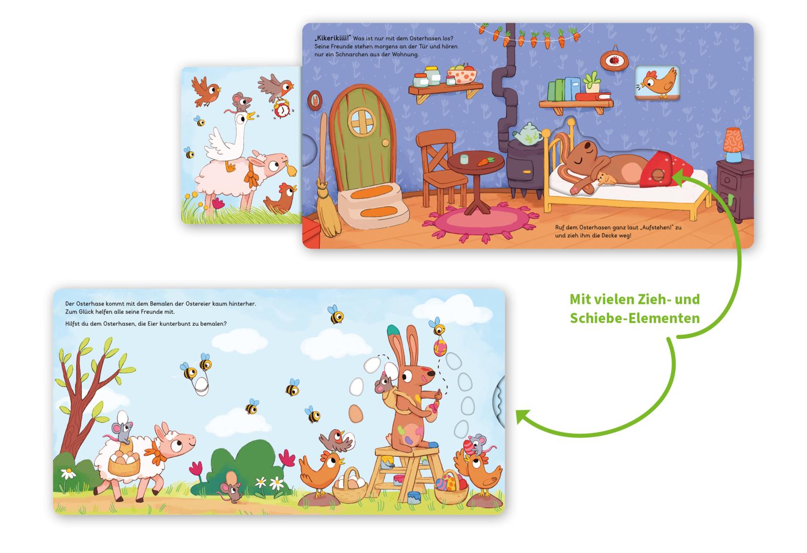 Ostern steht vor der Tür, doch der kleine Osterhase hat verschlafen! Jetzt heißt es: Aufwachen, Eier sammeln, bunt bemalen und schnell verstecken – und dabei braucht der Osterhase die Hilfe der Kinder. Mit lustigen Schiebe- und Dreheffekten können die Kleinen selbst aktiv werden. Jetzt kann der Osterhase seine morgendlichen Turnübungen machen, bei den Hühnern die Eier abholen, diese schön bemalen und mit seinen Freunden auf dem Motorrad davonbrausen. So wird die Geschichte lebendig und fördert ganz nebenbei die Feinmotorik.