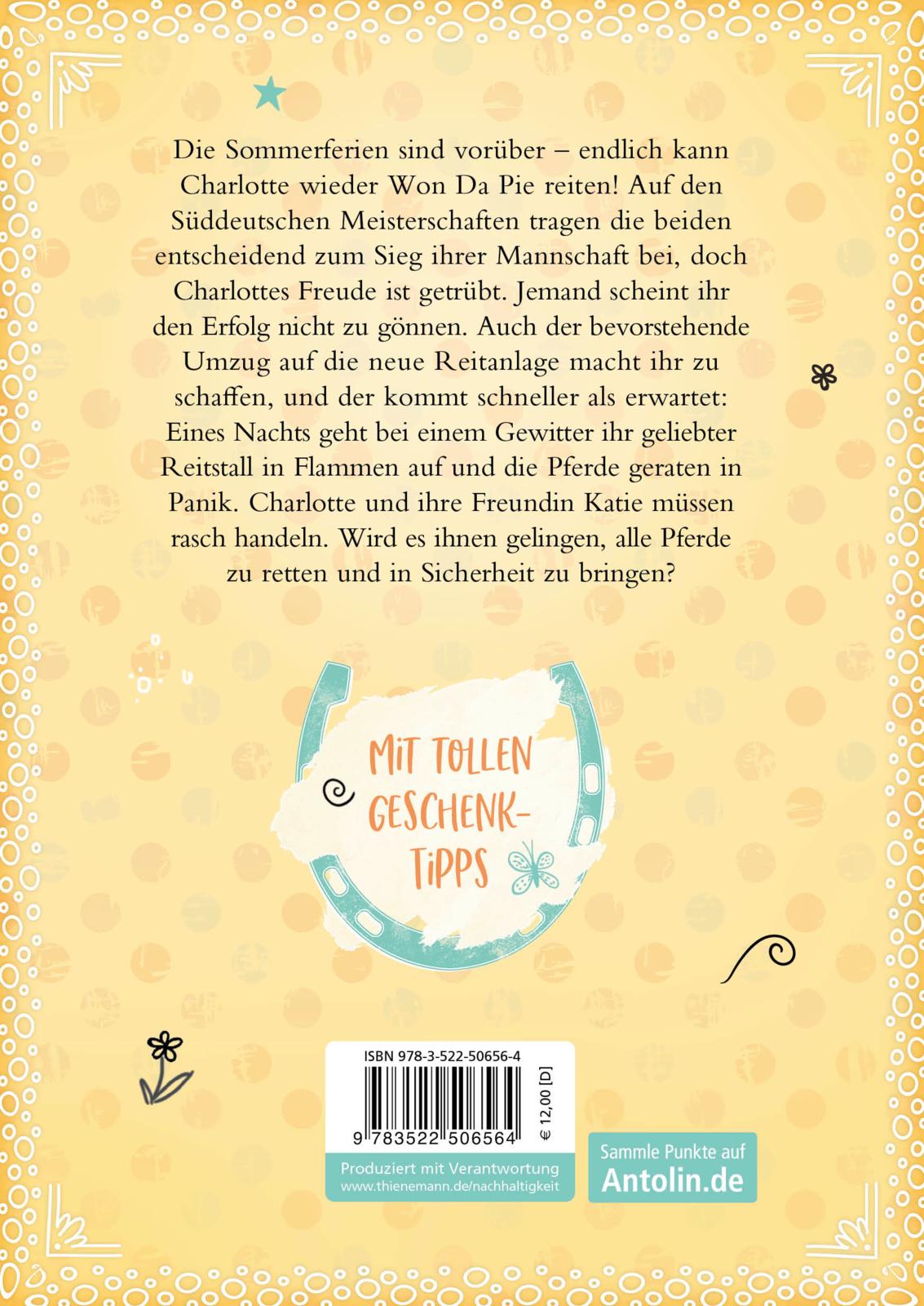 Die Sommerferien sind vorüber – endlich kann Charlotte wieder Won Da Pie reiten! Auf den Süddeutschen Meisterschaften tragen die beiden entscheidend zum Sieg ihrer Mannschaft bei, doch Charlottes Freude ist getrübt. Jemand scheint ihr den Erfolg nicht zu gönnen. Auch der bevorstehende Umzug auf die neue Reitanlage macht ihr zu schaffen, und der kommt schneller als erwartet: Eines Nachts geht bei einem Gewitter ihr geliebter Reitstall in Flammen auf und die Pferde geraten in Panik. Charlotte und ihre Freundin Katie müssen rasch handeln. Wird es ihnen gelingen, alle Pferde zu retten und in Sicherheit zu bringen?