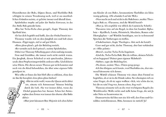 In der Magischen Bibliothek der Bukskommt ein neuer Buchschutzgeist zur Welt – doch zum Feiern bleibt den Hütern der Bücher und Nola, Thommy und Mira keine Zeit: Finn und Geraldine geraten in ein Buch ohne Auswegund müssen mithilfe des launischen Phantánasischen Schlüssels durch Zeit und Mythen reisen. Doch der geheime Orden der Athanæer verbündet sich für seine Jagd nach genau diesem Schlüssel mit dem größten Feind der Buks, dem rachsüchtigen Lucius Degen – und der will in das Herz der Buchwelt, um es endgültig zu zerstören. Können Nola, Mira, der junge Orakelmeister Thommy und dieBuksdie Bibliothek verteidigen und Finn und Geraldine retten?