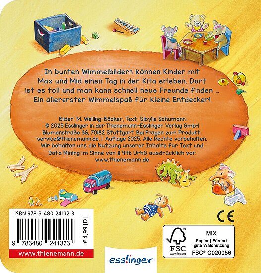 Mit den Geschwistern Max und Mia erleben kleine Entdecker:innen einen spannenden Tag in der Kita: Vom fröhlichen Morgenkreis mit Singen und Spielen über Malen, Basteln und den Gang zur Toilette bis hin zum gemeinsamen Mittagessen und der gemeinsamen Mittagspause – auf jeder Seite gibt es liebevoll gestaltete Wimmelbilder und einfache Suchaufgaben zu entdecken. So wird der Kita-Alltag zum spannenden Erlebnis und das Mini-Wimmelbuch zum perfekten Begleiter für zu Hause oder unterwegs.