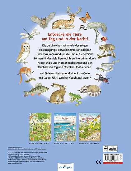 Dieses Wimmelbuch lädt Kinder ab 3 Jahren ein, die einzigartige Tierweltin unterschiedlichen Lebensräumen kennenzulernen – bei Tag und bei Nacht! So sieht man z.B. Familie Wildschwein und die kleinen Füchse auf der linken Seite tagsüber schlafend und auf der rechten Seite, wenn es dunkel ist, beim Spielen, Planschen und auf Nahrungssuche. Auch die Tiere im Urwald kann man hier entdecken und auf den detailreichen Wimmelbildern erfahren, zu welcher Tageszeit sie aktiv sind.