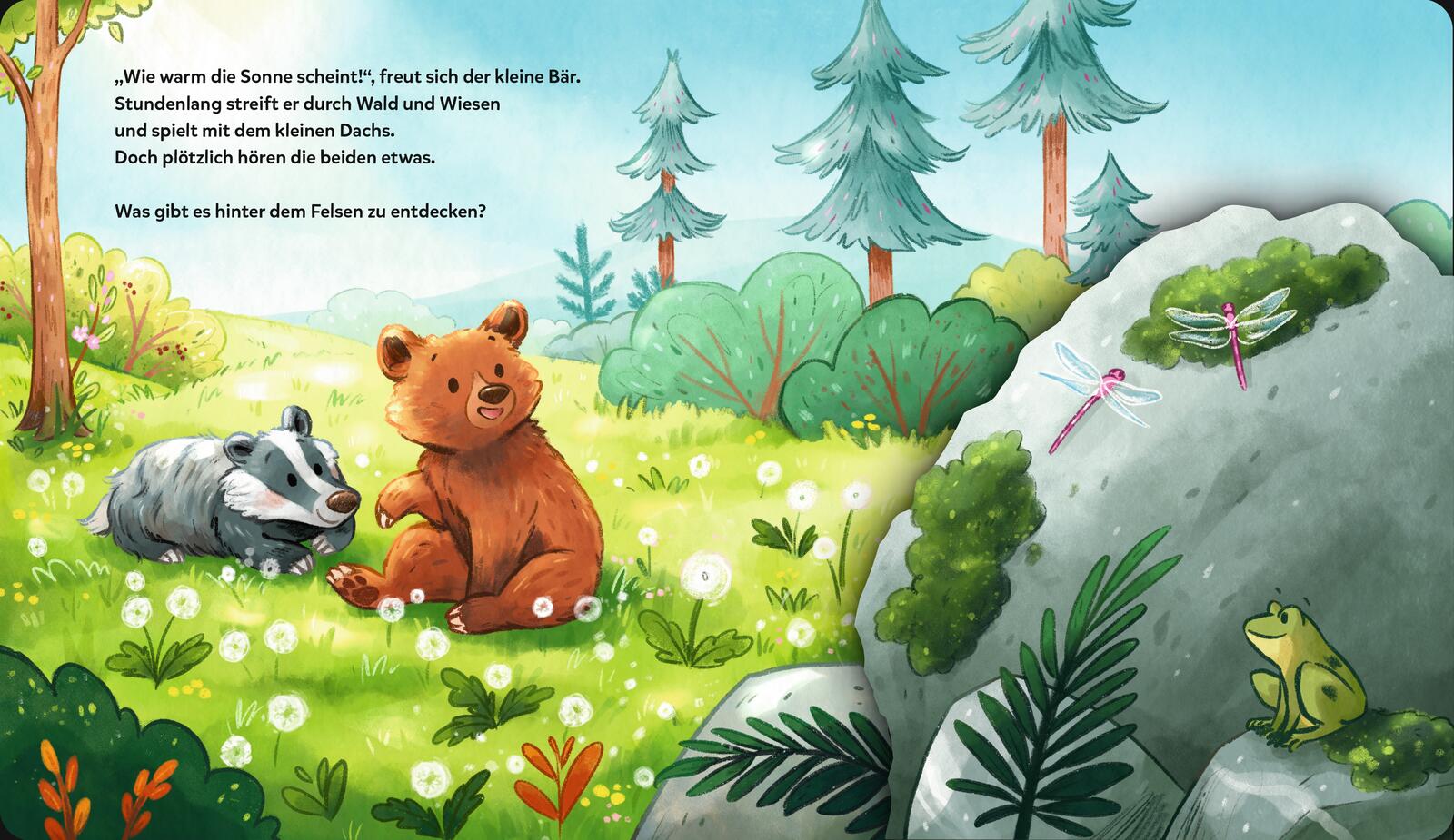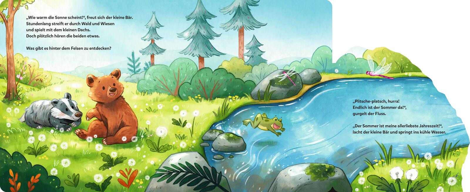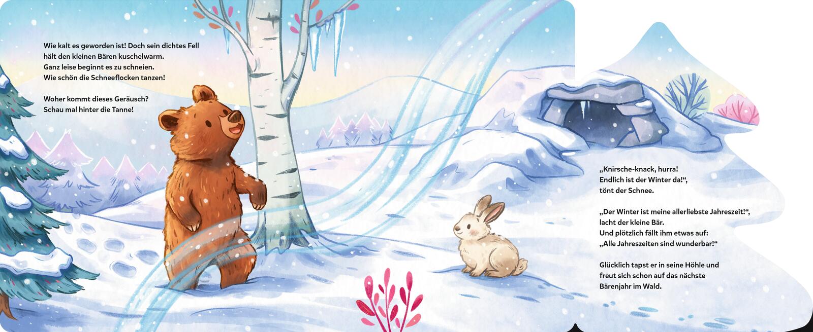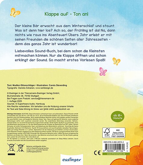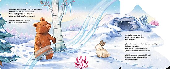 Der kleine Bär erwacht aus dem Winterschlaf. Was ist denn hier für ein Lärm? Ach so, der Frühling ist da! Na dann nichts wie raus ins Abenteuer! Übers Jahr erlebt er die vielen schönen Seiten der Jahreszeiten: Vogelgezwitscher, Plantschen im Bach, durchs bunte Herbstlaub toben ... Als es schließlich Winter wird, stapft er müde zurück zu seiner Schlafhöhle. Bis nächstes Jahr, kleiner Bär!