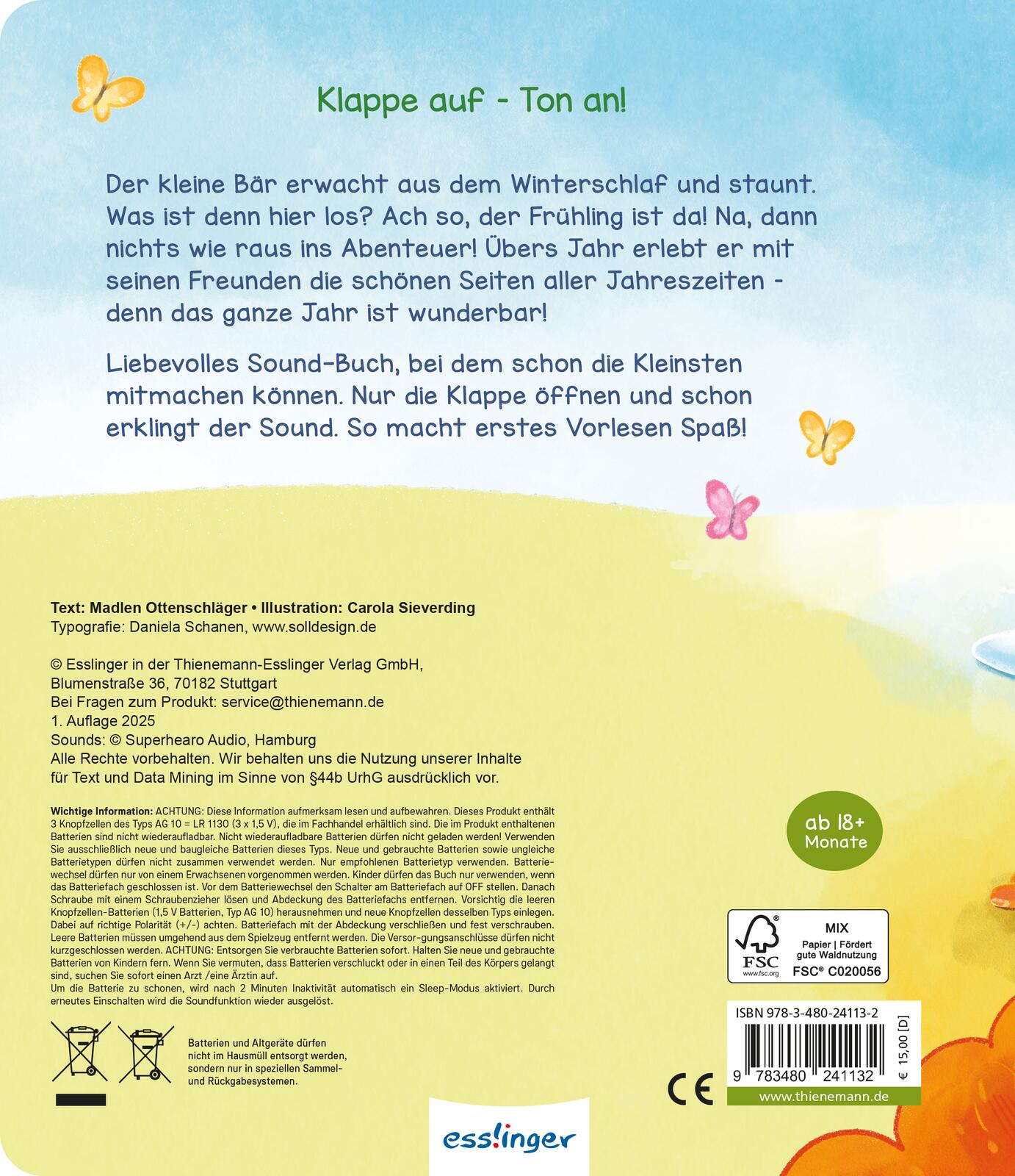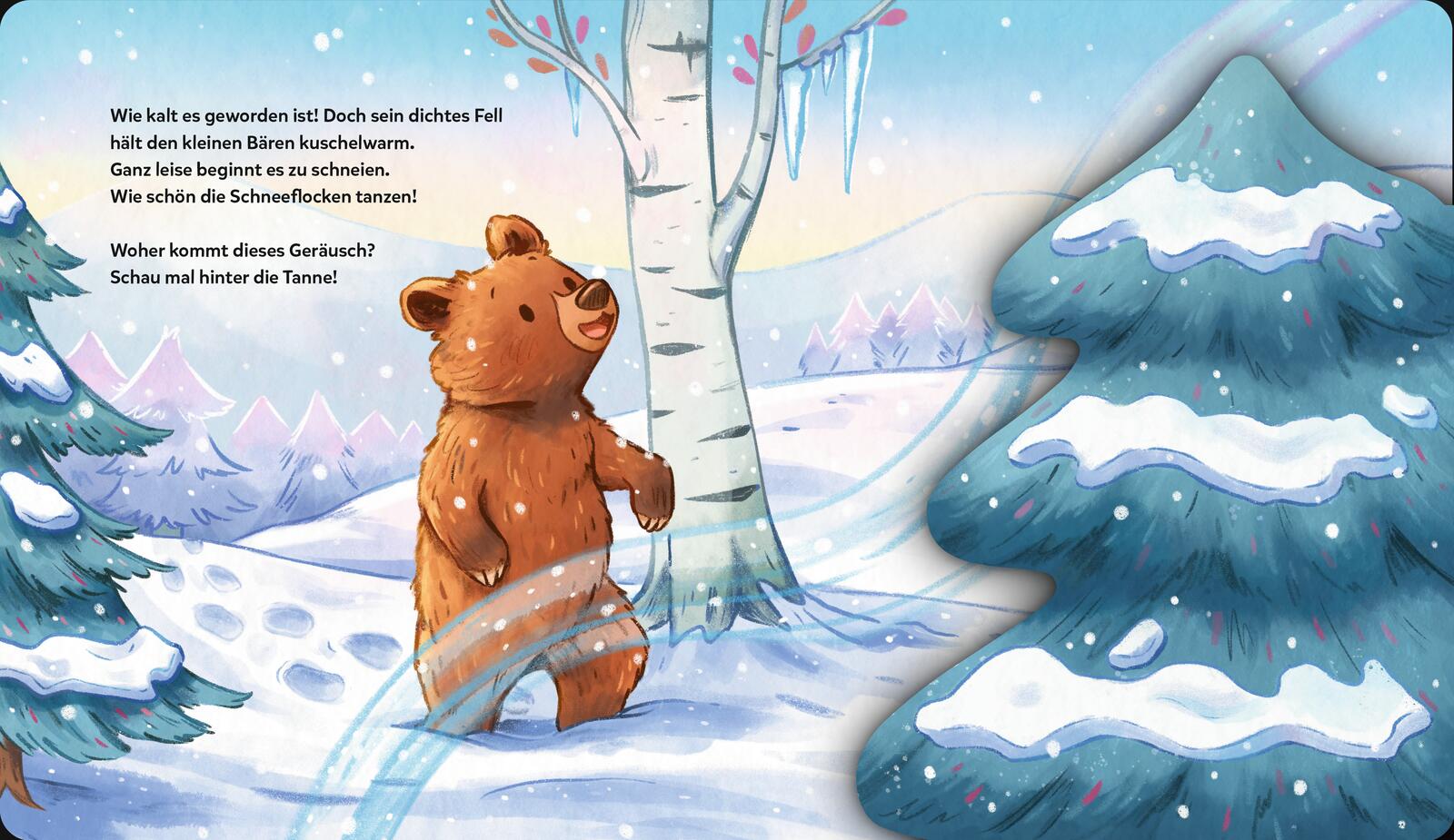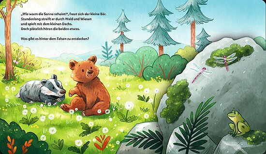 Der kleine Bär erwacht aus dem Winterschlaf. Was ist denn hier für ein Lärm? Ach so, der Frühling ist da! Na dann nichts wie raus ins Abenteuer! Übers Jahr erlebt er die vielen schönen Seiten der Jahreszeiten: Vogelgezwitscher, Plantschen im Bach, durchs bunte Herbstlaub toben ... Als es schließlich Winter wird, stapft er müde zurück zu seiner Schlafhöhle. Bis nächstes Jahr, kleiner Bär!