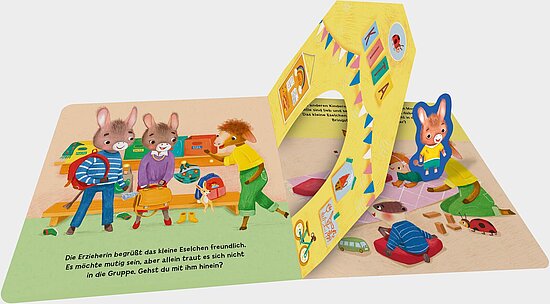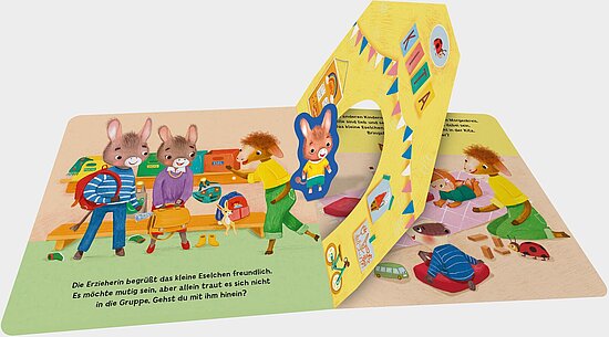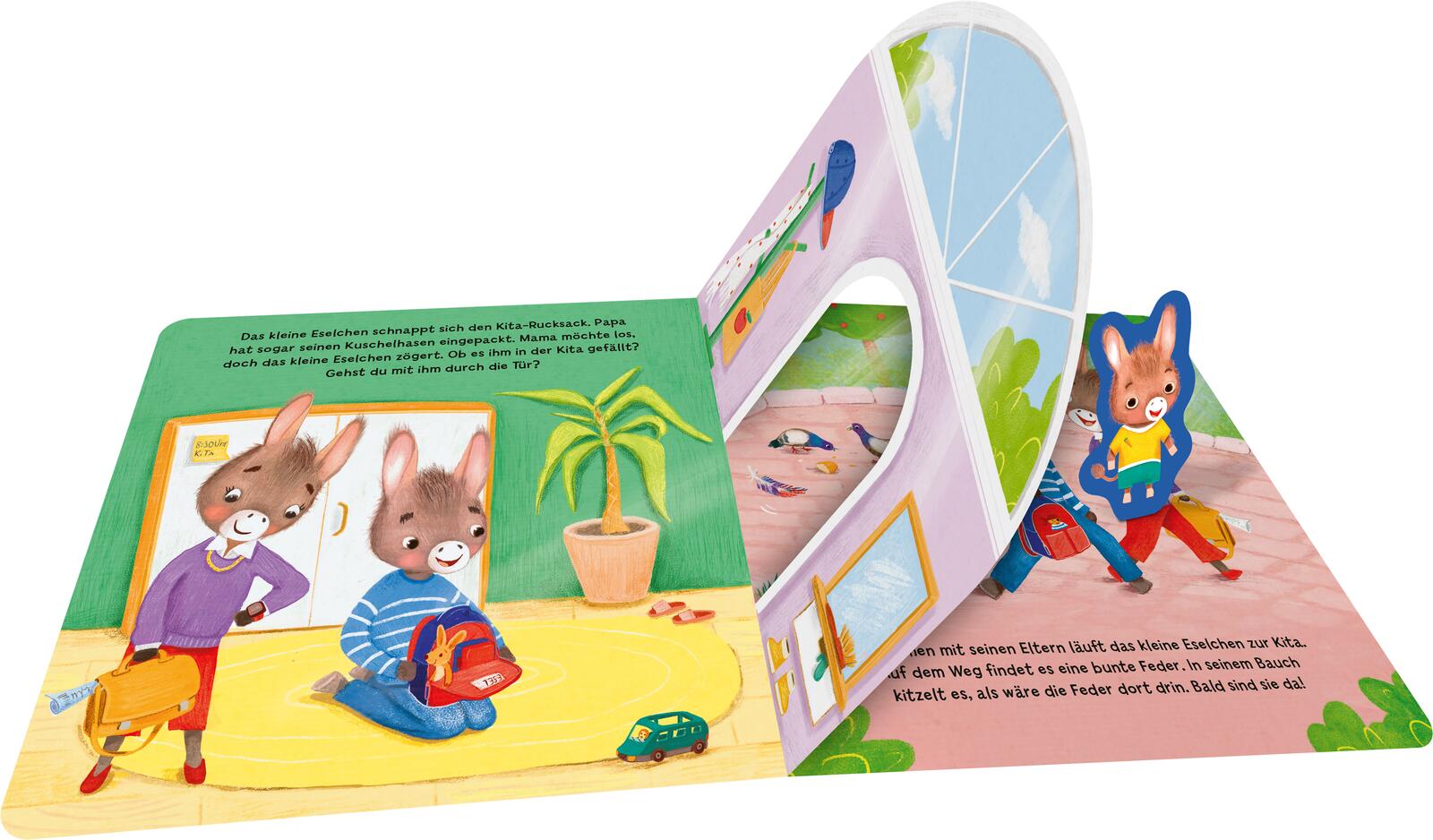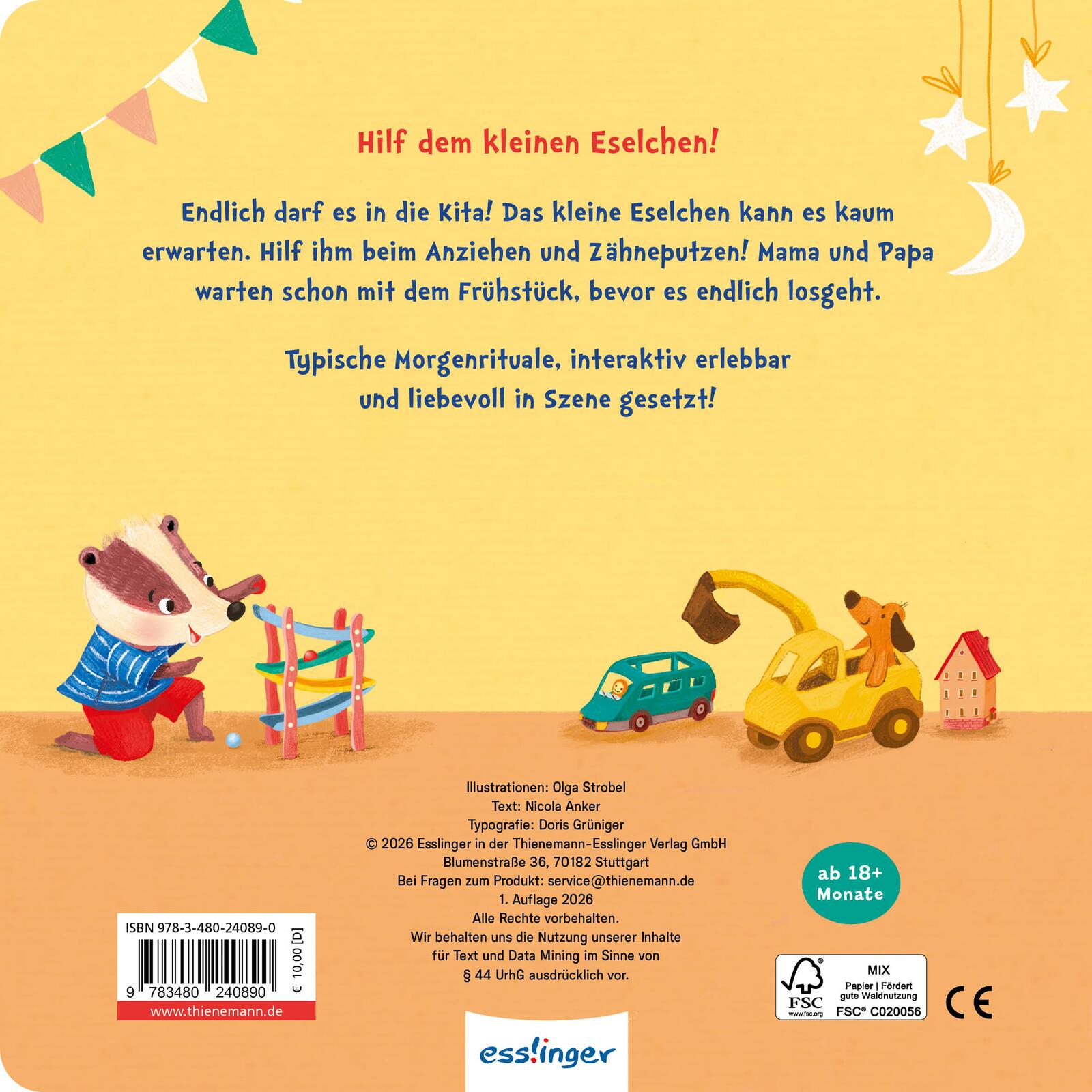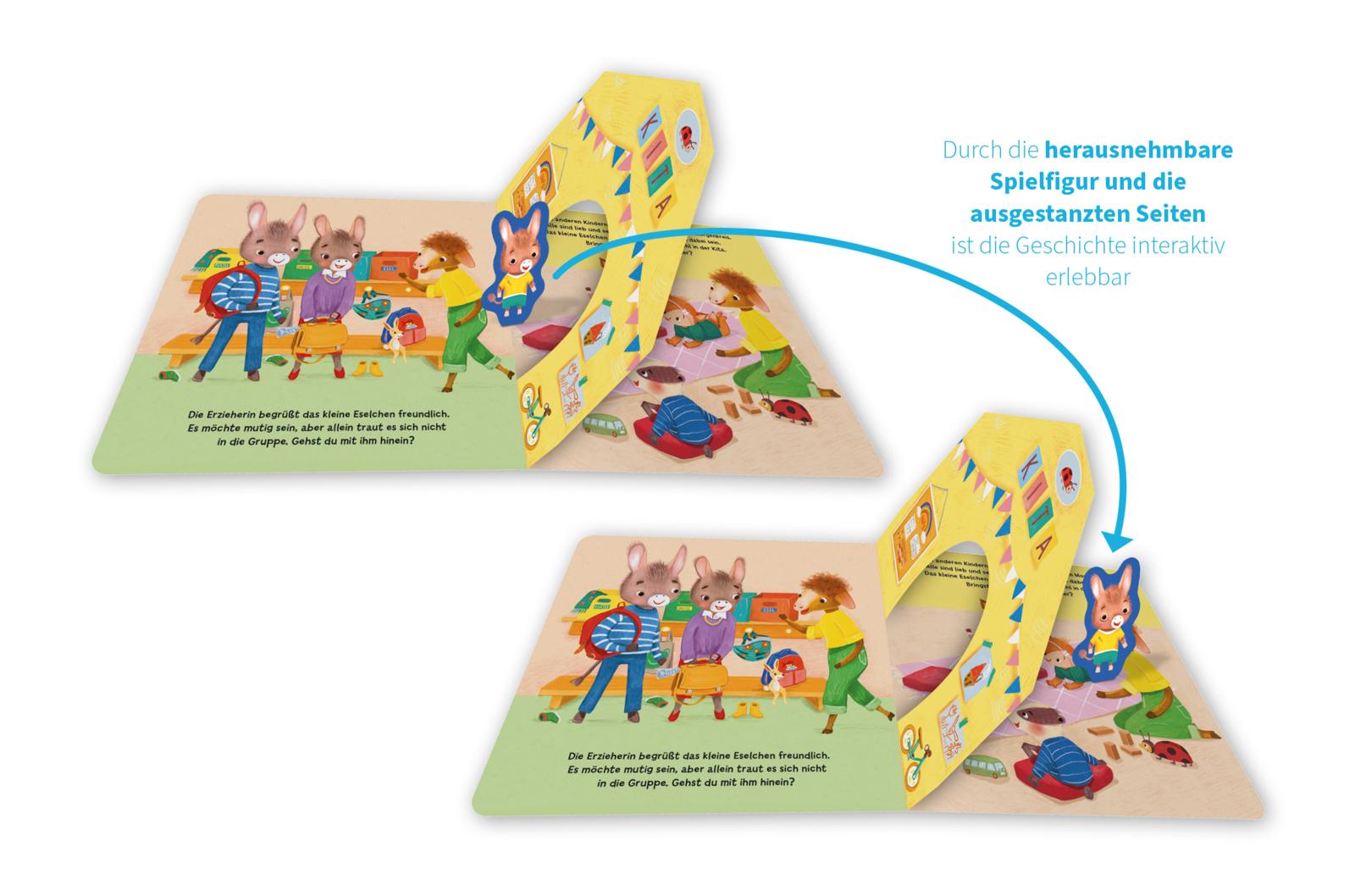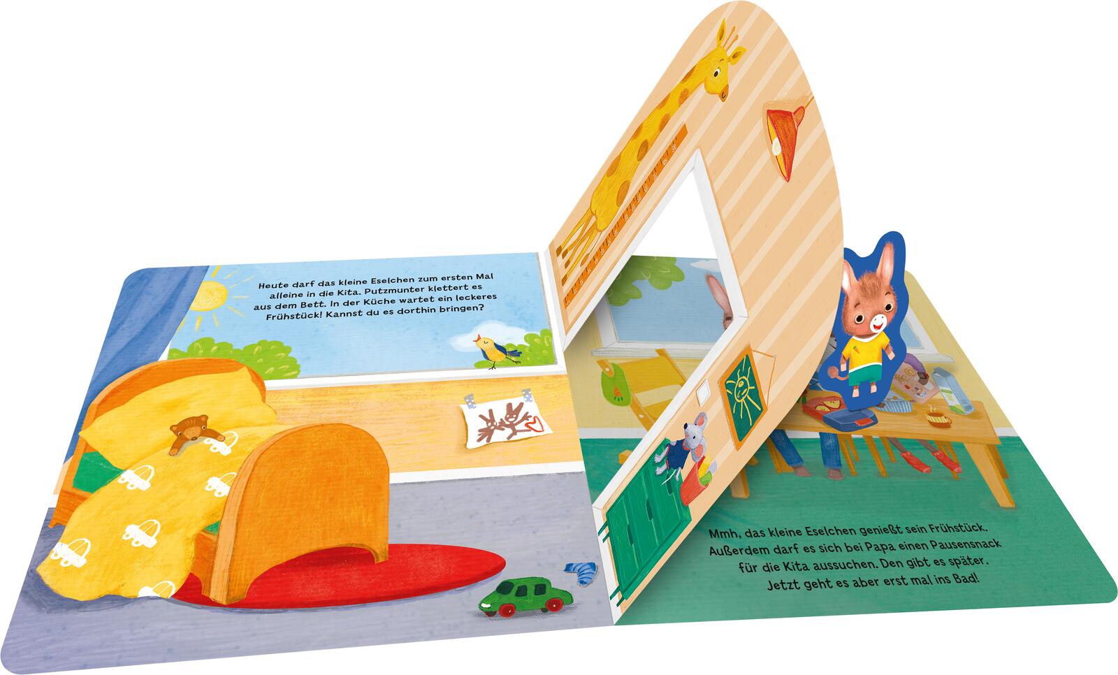 Endlich Kitakind! Der kleine Esel kann es kaum erwarten. Klar, dass Mama und Papa ihn an seinem großen Tag begleiten. Auch dieAllerkleinstenab 18 Monaten helfen mit. Sie bringen ihn ins Bad, zum Anziehen und Frühstücken. Und sie dürfen für den kleinen Esel mutig sein, wenn er sich doch noch nicht allein in den Morgenkreis traut.