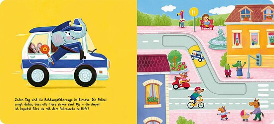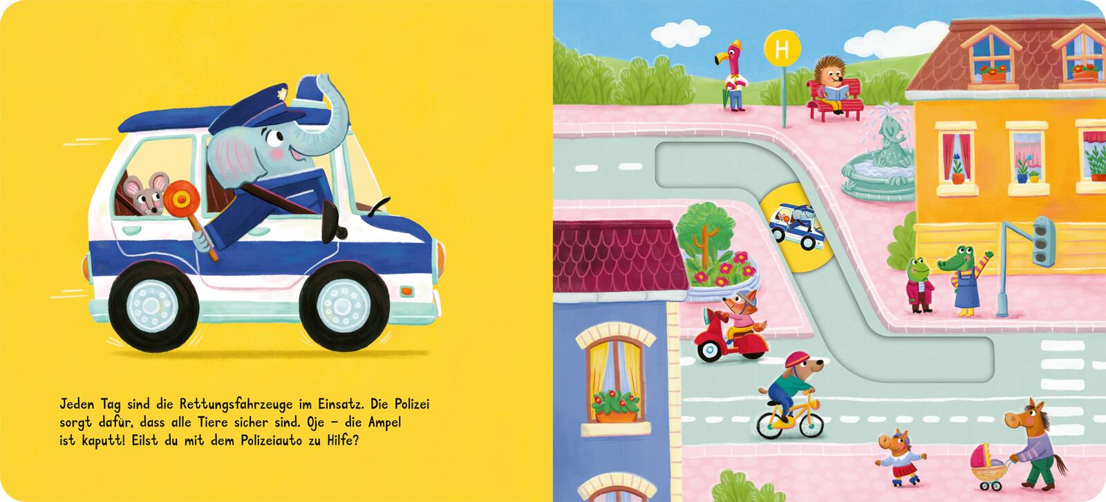 Mit Tatütata im Einsatz! Das Polizeiauto ist unterwegs, um den Verkehr zu regeln. Die Feuerwehr sichert ein großes Lagerfeuer im Park. Der Abschleppwagen eilt zur Unfallstelle. Und der Krankenwagen bringt einen kleinen Patienten ins Krankenhaus.