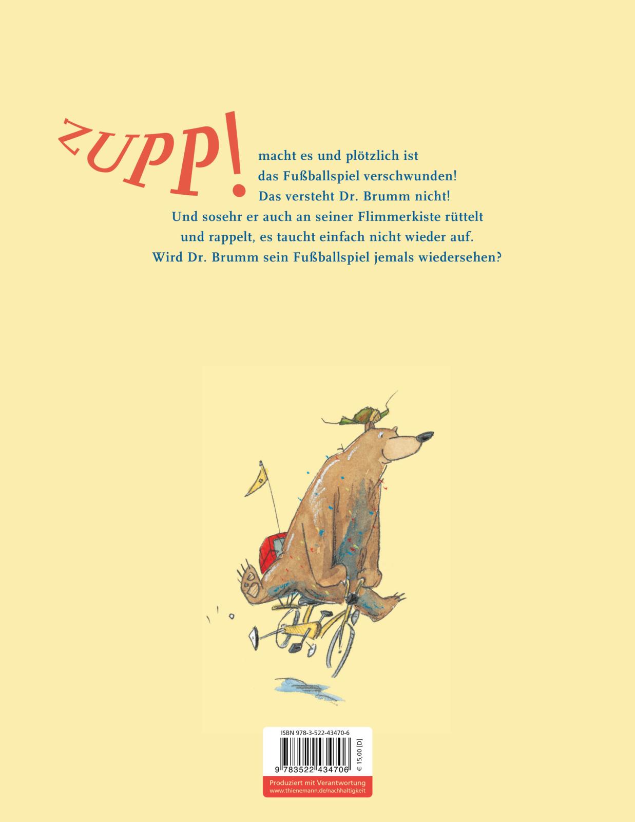 Dr. Brumm macht das, was er jeden Samstag macht: Fußball schauen. Doch plötzlich hört die Flimmerkiste auf zu flimmern. „Tonnerwetter!“, staunt Dr. Brumm und versteht nicht, wohin das Fußballspiel verschwunden ist. Doch so sehr er auch an seiner Flimmerkiste rüttelt und rappelt, es taucht einfach nicht wieder auf. Wird Dr. Brumm seine Flimmerkiste wieder zum Laufen bringen?