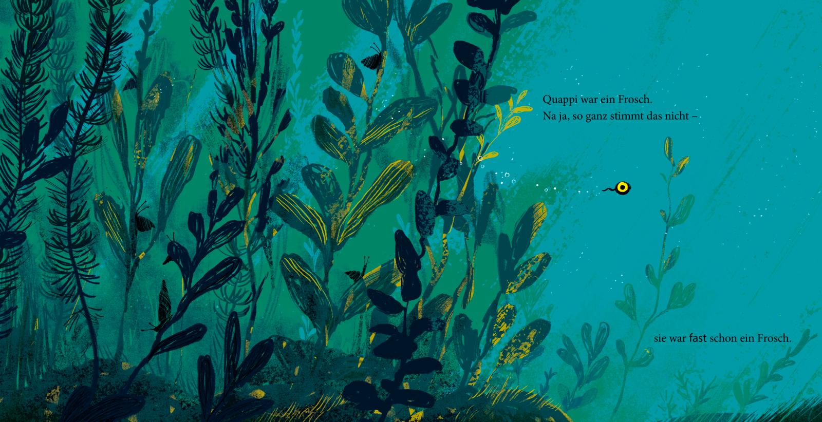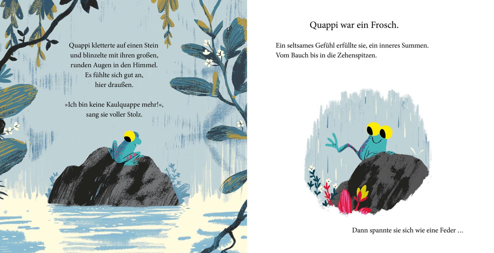 Quappi ist die kleinste Kaulquappe im großen Teich. Gemeinsam mit seinen Geschwistern fühlt er sich sicher – bis eines Tages alle verschwunden sind. Plötzlich ist Quappi ganz allein. Doch dann geschieht das Wunder: Quappi wird zum Frosch und entdeckt, dass er nicht nur gewachsen ist, sondern auch seine Familie wiederfindet. Diese warmherzige Geschichte begleitet Kinder auf ihrem Weg, mutig zu sein und den Sprung ins Leben zu wagen. Die liebevollen Illustrationen und der kindgerechte Text machen das Buch zu einem besonderen Begleiter beim Erwachsenwerden.