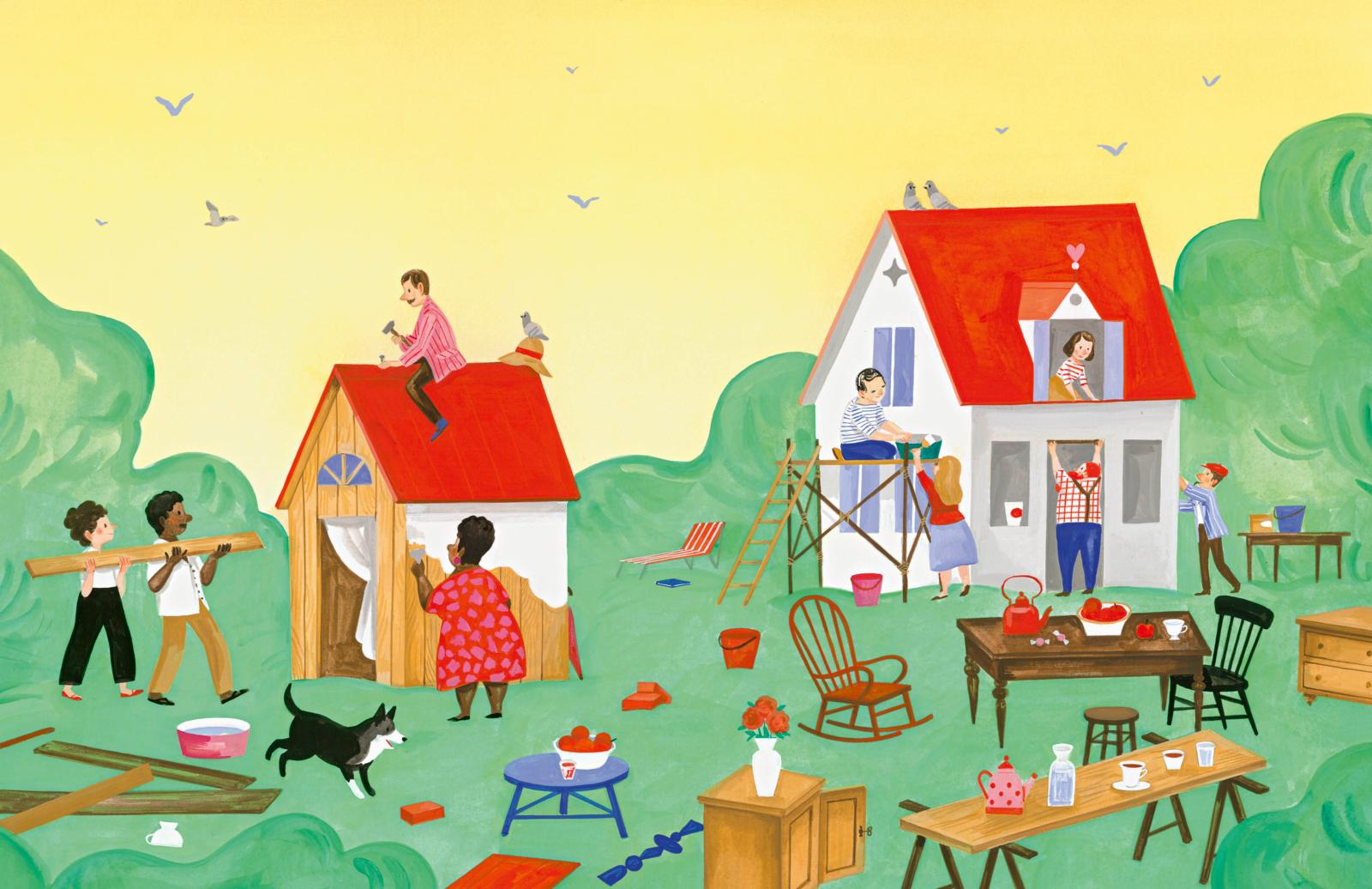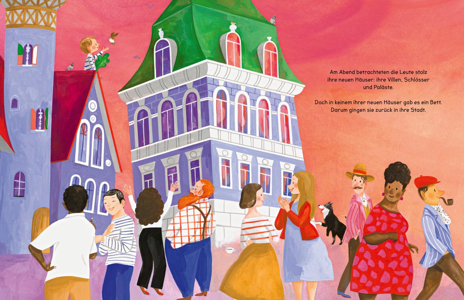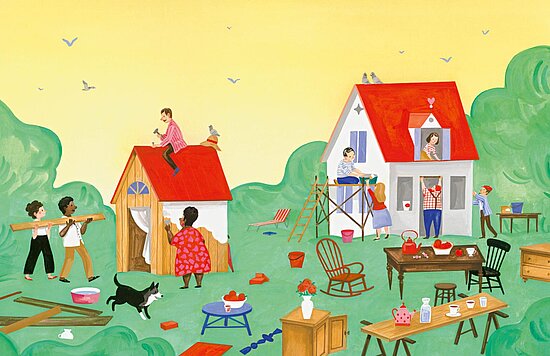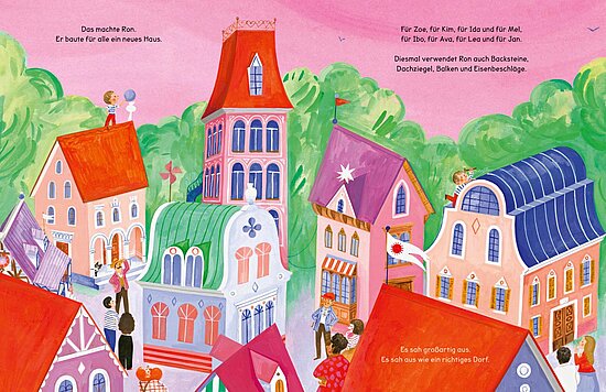 Ron baut sich eine Hütte – einfach so, an einem Sonntag. Die ist so toll, dass bald alle auch eine wollen. Und Ron? Der baut weiter: Hütten, Häuser, Paläste – immer größer, immer verrückter. Doch als ein Sturm aufzieht, merken alle, dass nicht alles, was glänzt, auch für die Ewigkeit gemacht ist. Ein außergewöhnliches Bilderbuch, das Kinder und Erwachsene zum Nachdenken und Schmunzeln einlädt – und zum gemeinsamen Gespräch über das, was im Leben wirklich zählt.