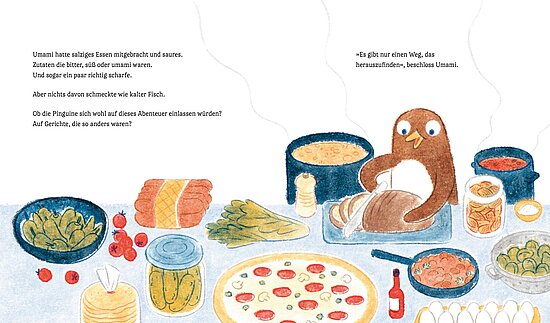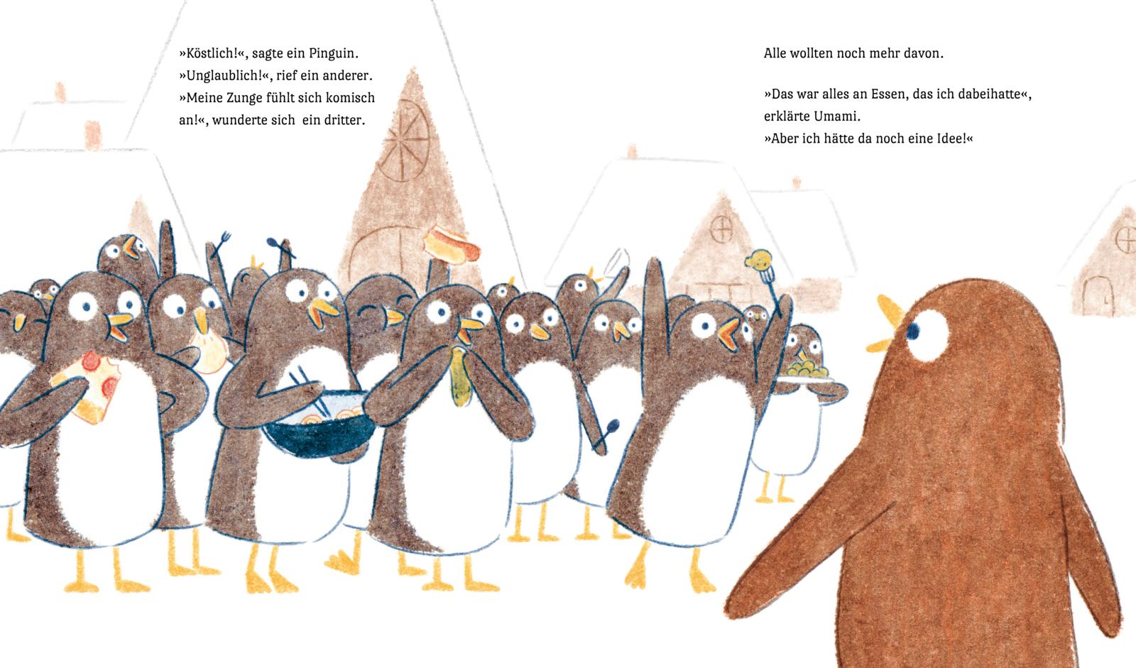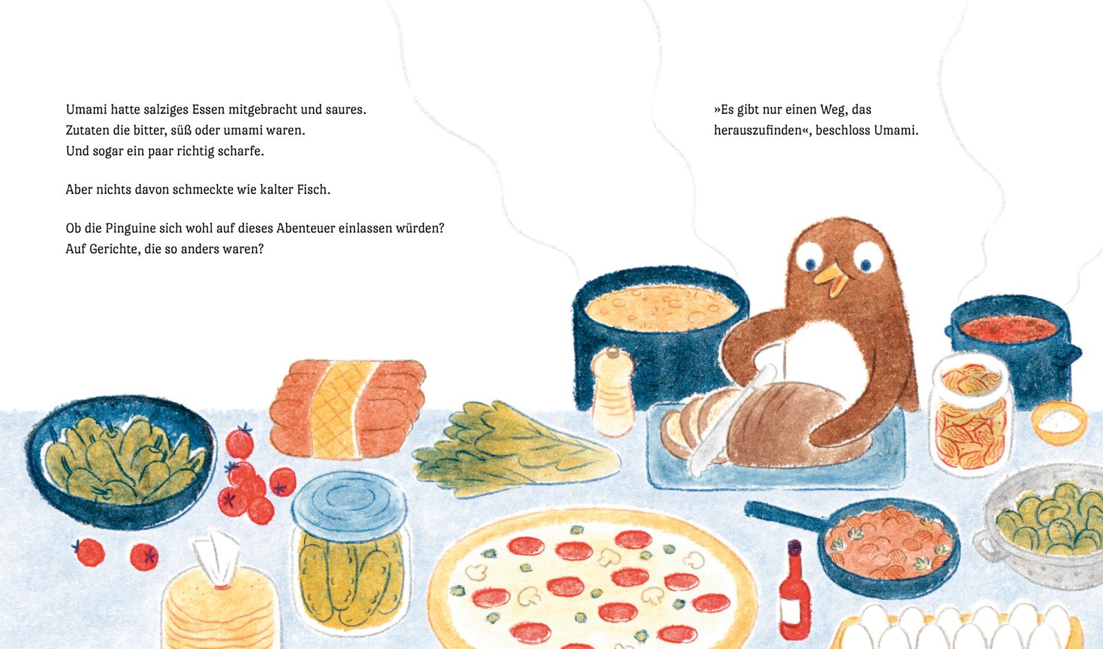Tag für Tag immer nur kalten Fisch? Davon hat der kleine Pinguin Umami genug! Neugierig und voller Abenteuerlust verlässt er seine Heimat, um in der großen weiten Welt neue Gerichte zu entdecken. Auf seiner Reise begegnet er würzigen Suppen, süßem Gebäck, scharfen Klößchen und wunderbar sauren Gürkchen – und lernt, wie spannend und lecker Vielfalt auf dem Teller sein kann. Doch wird er es schaffen, auch seine Freunde zu Hause für die neuen Köstlichkeiten zu begeistern?