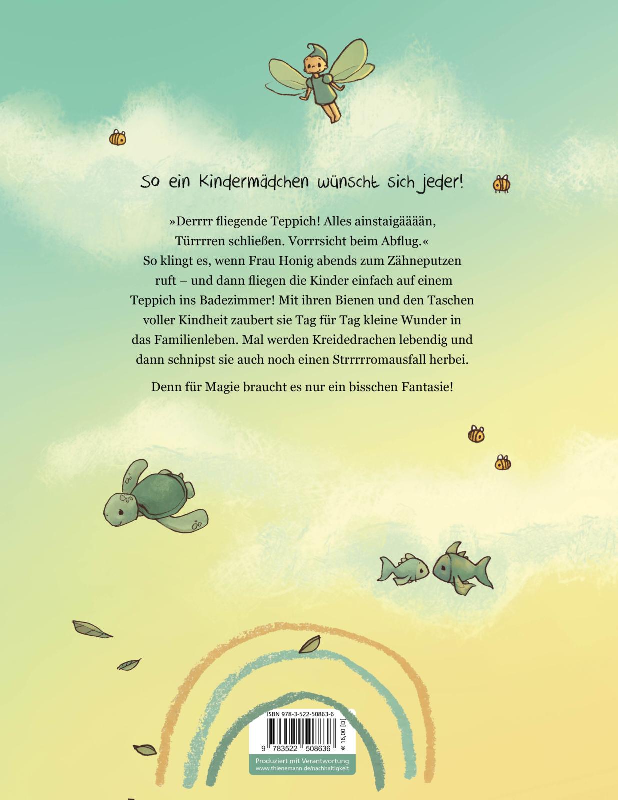 „Derrrr fliegende Teppich! Alles ainstaigääään, Türrrren schließen. Vorrrsicht beim Abflug.“ So klingt es, wenn Frau Honig abends zum Zähneputzen ruft – und statt zu laufen, fliegen die Kinder auf einem echten Teppich durch die Wohnung! Frau Honig ist kein gewöhnliches Kindermädchen. Mit ihrem senfgelben Mantel, ihren Bienen und den Taschen voller Kindheit zaubert sie Tag für Tag kleine Wunder in das Leben der Kinder. Mal verschwinden böse Worte schwuppdiwupps in einer Schublade, mal werden Drachen aus Kreide lebendig und heben mit den Kindern ab in die Lüfte. Und wenn jemand traurig ist, darf er in schönen Wörtern baden, bis das Herz wieder warm wird. Für Magie braucht es nur ein bisschen Fantasie – und jemanden, der an Wunder glaubt.