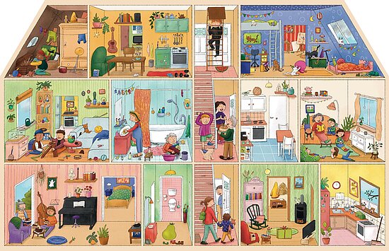 Ob die kleine Maus, die drei Katzen auf Trab hält, oder Hund Oskar, der überall willkommen ist – hier wimmelt es vor großen und kleinen Abenteuern. Die detailreichen Illustrationen regen zum Suchen, Erzählen und gemeinsamen Entdecken an und fördern spielerisch die Sprachentwicklung. Die besondere Konturstanzung am Dach macht das Buch zu einem echten Hinguckerund sorgt für ein haptisches Extra beim Blättern der Seiten.